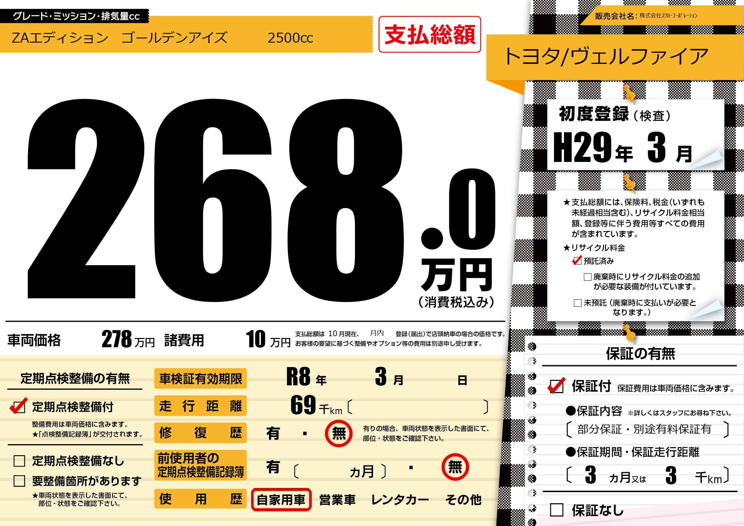 | 車名 | トヨタ/ヴェルファイア | グレード ミッション 排気量 |