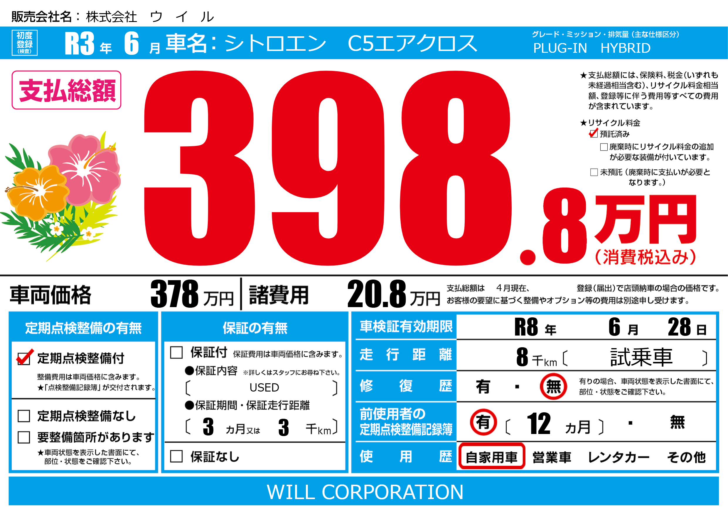| 車名 | シトロエン C5エアクロス | グレード ミッション 排気量 |