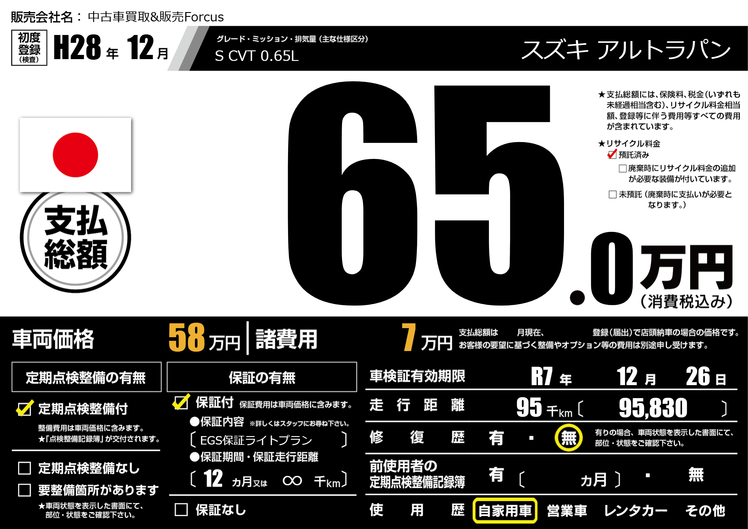 | 走行キロ | 9.5万km | 初年度登録 | H28年12月 |