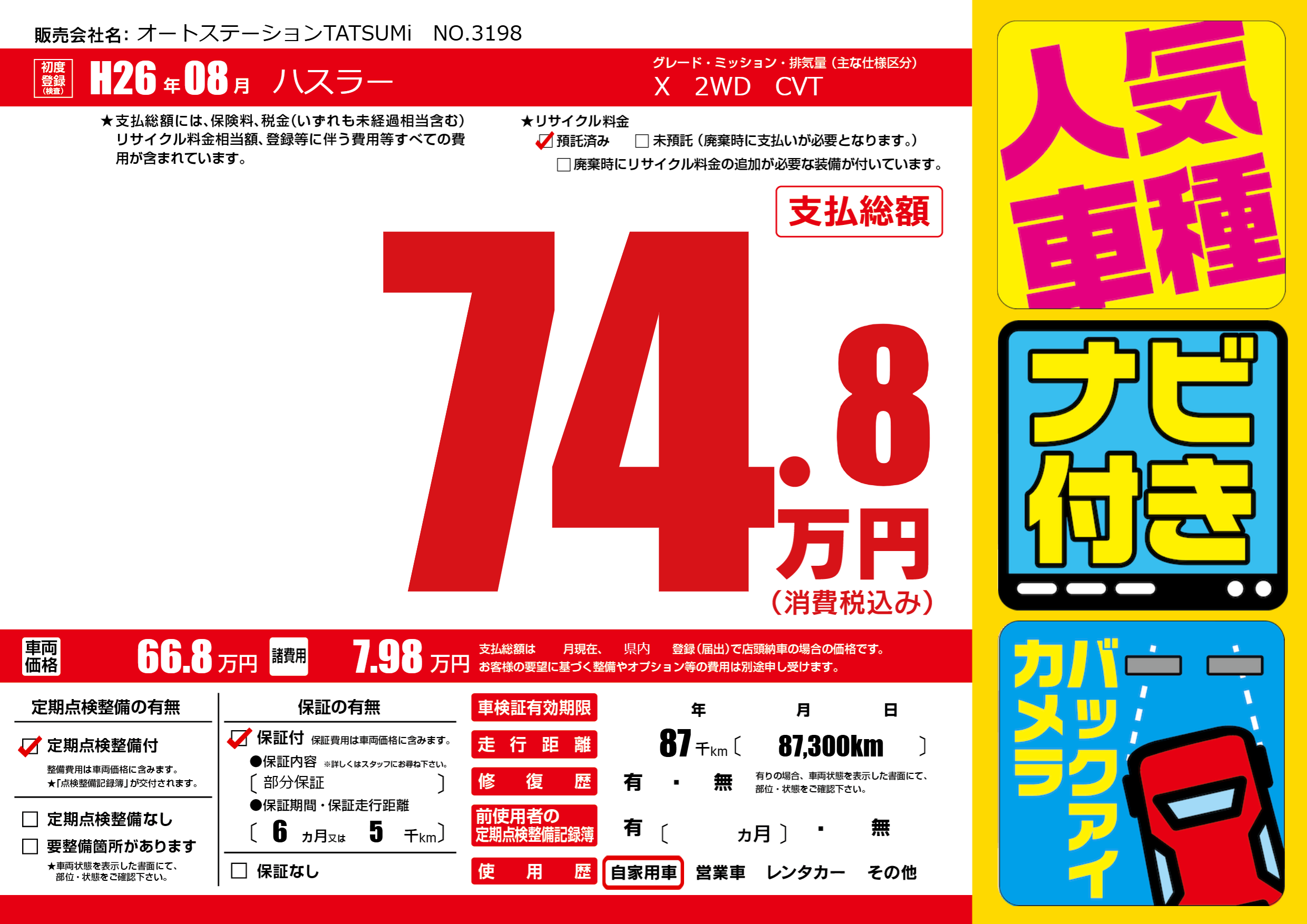 | 車名 | ハスラー | グレード ミッション 排気量 |