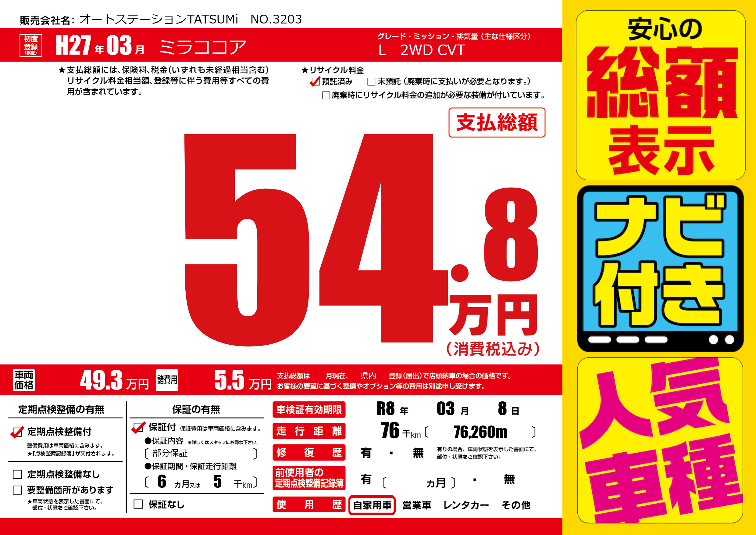 | 車検制限 | R8年 03月 8日 | ||