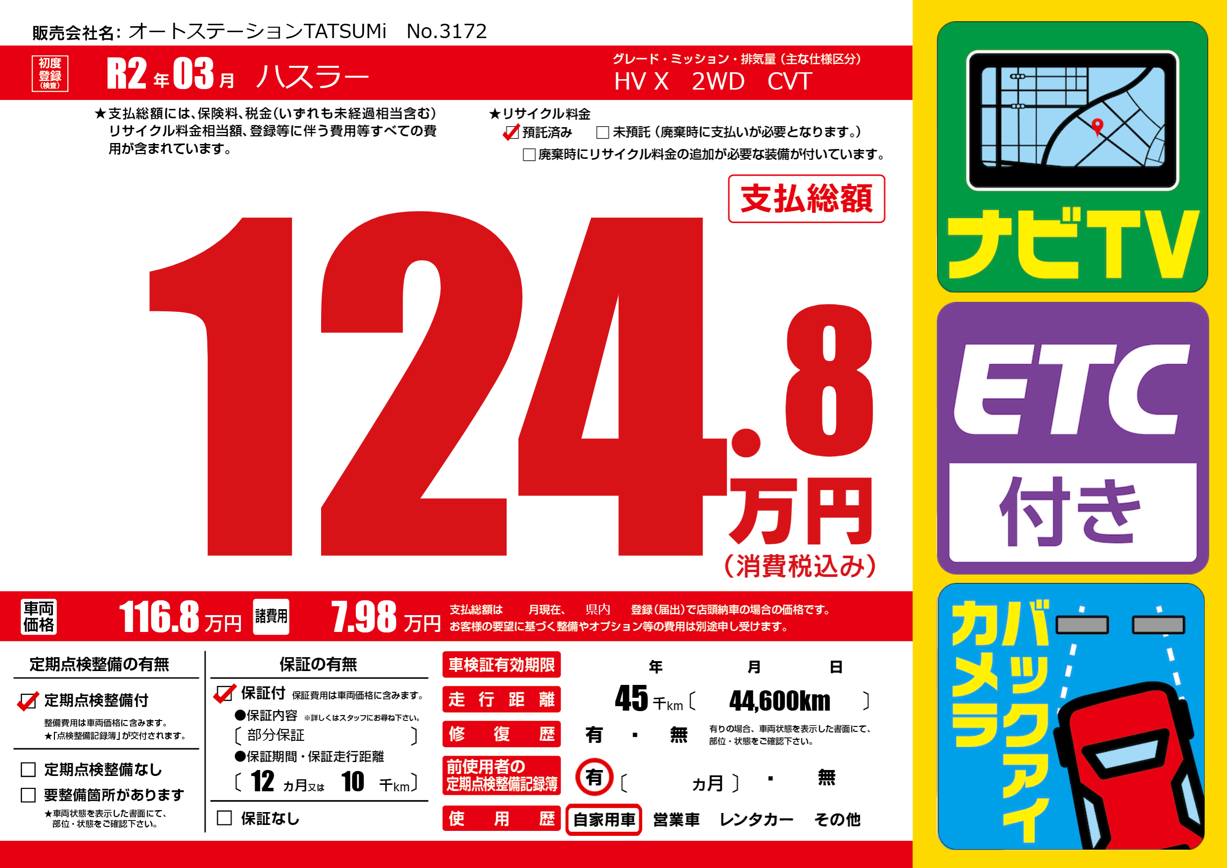 | 走行キロ | 4.5万km | 初年度登録 | R2年03月 |