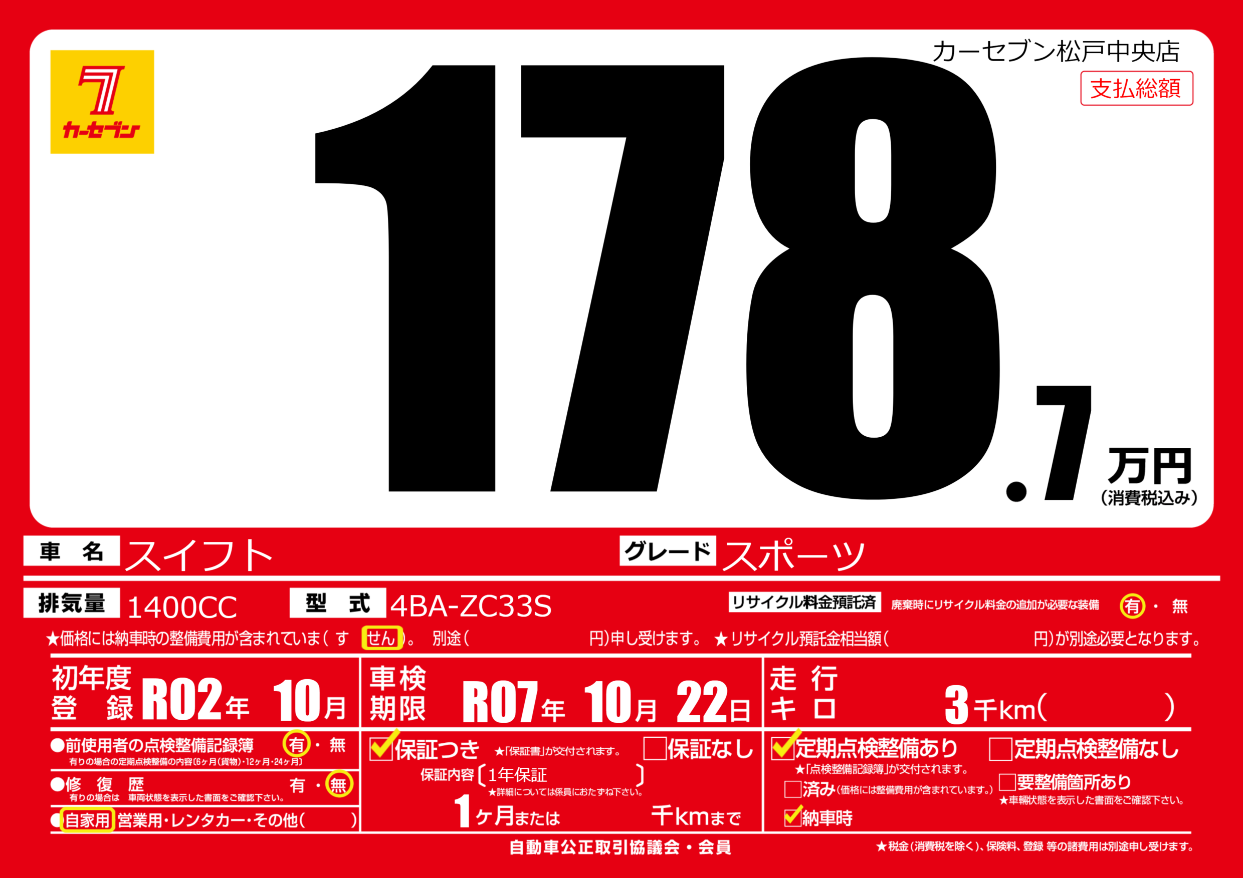 | 車名 | スイフト | グレード ミッション 排気量 |
