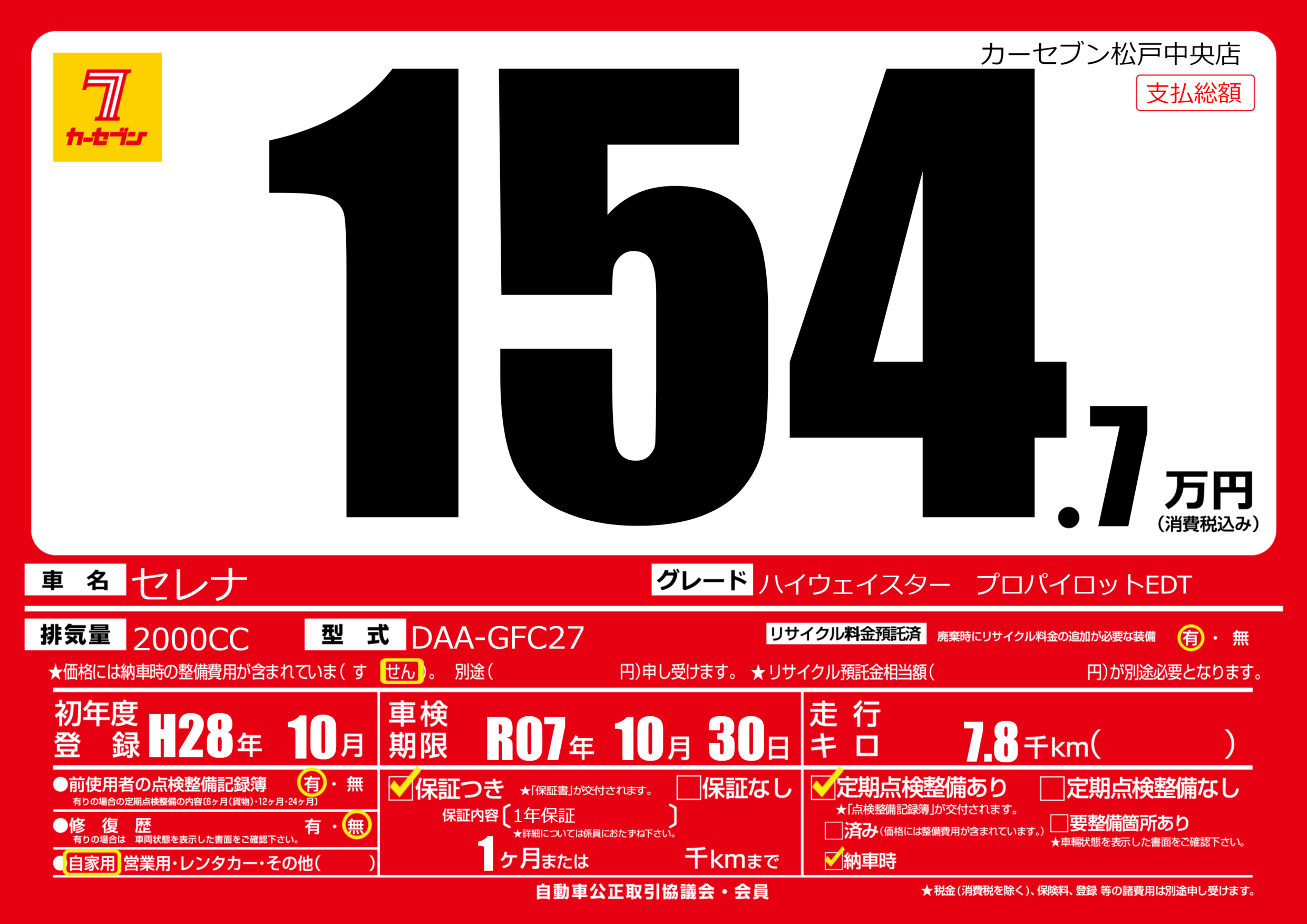 | 車名 | セレナ | グレード ミッション 排気量 |