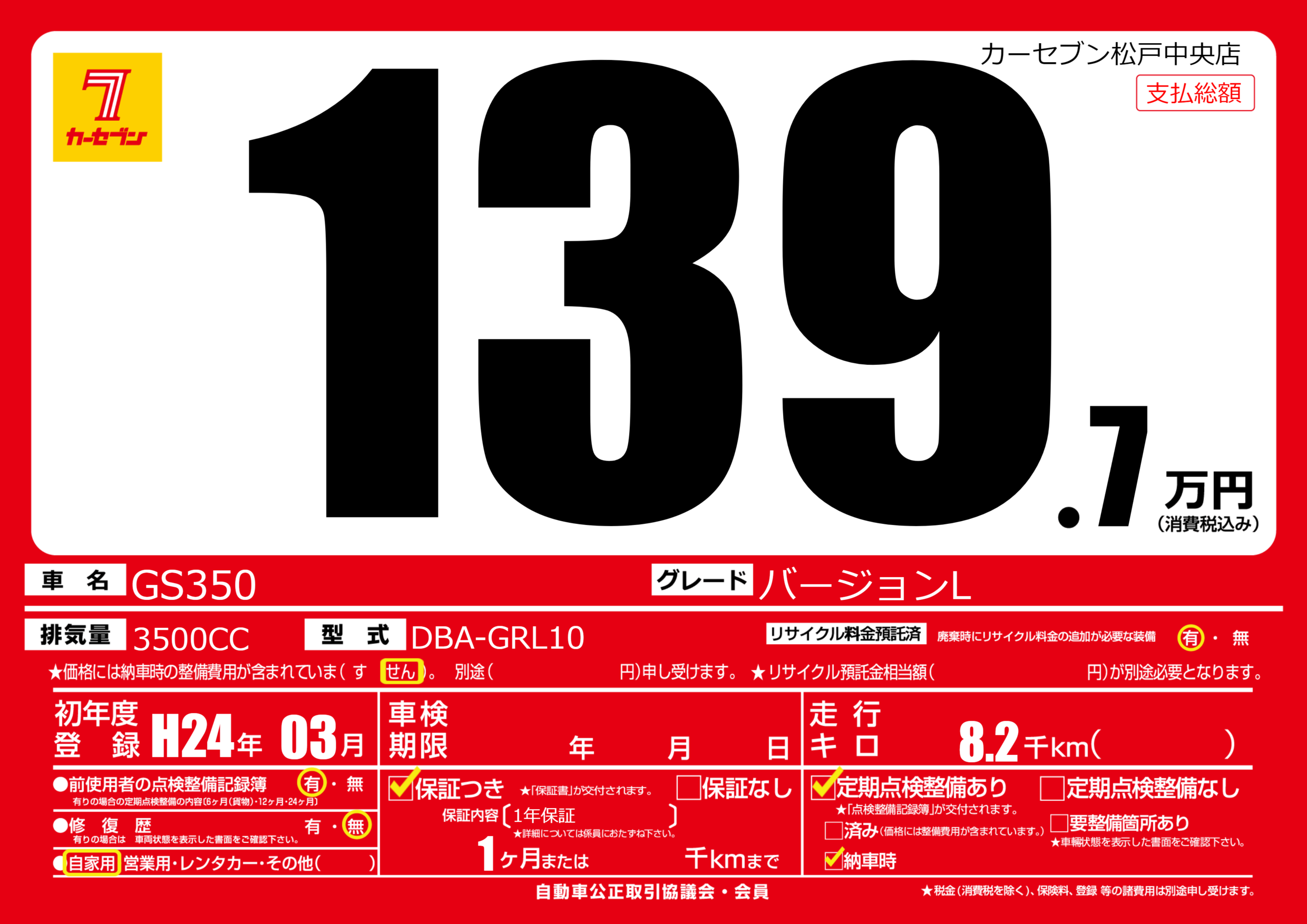 | 車名 | GS350 | グレード ミッション 排気量 |