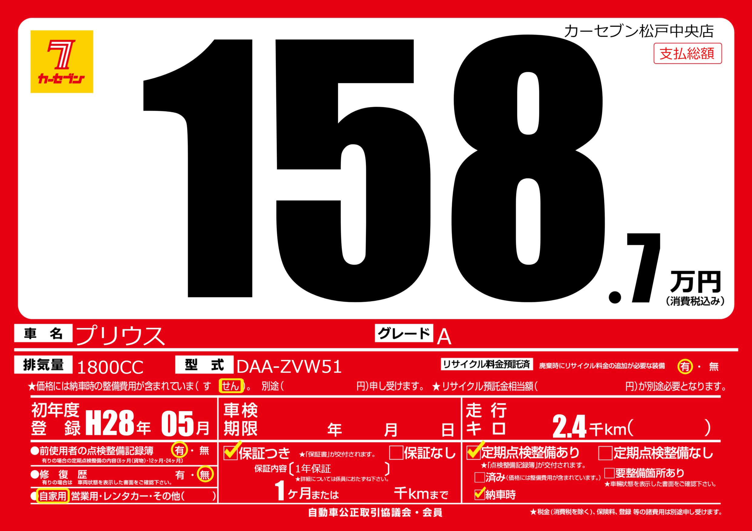 | 車名 | プリウス | グレード ミッション 排気量 |