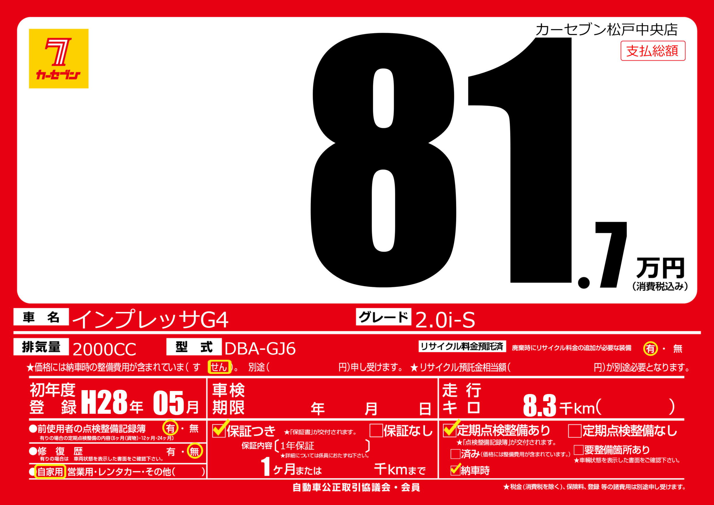 | 車名 | インプレッサG4 | グレード ミッション 排気量 |