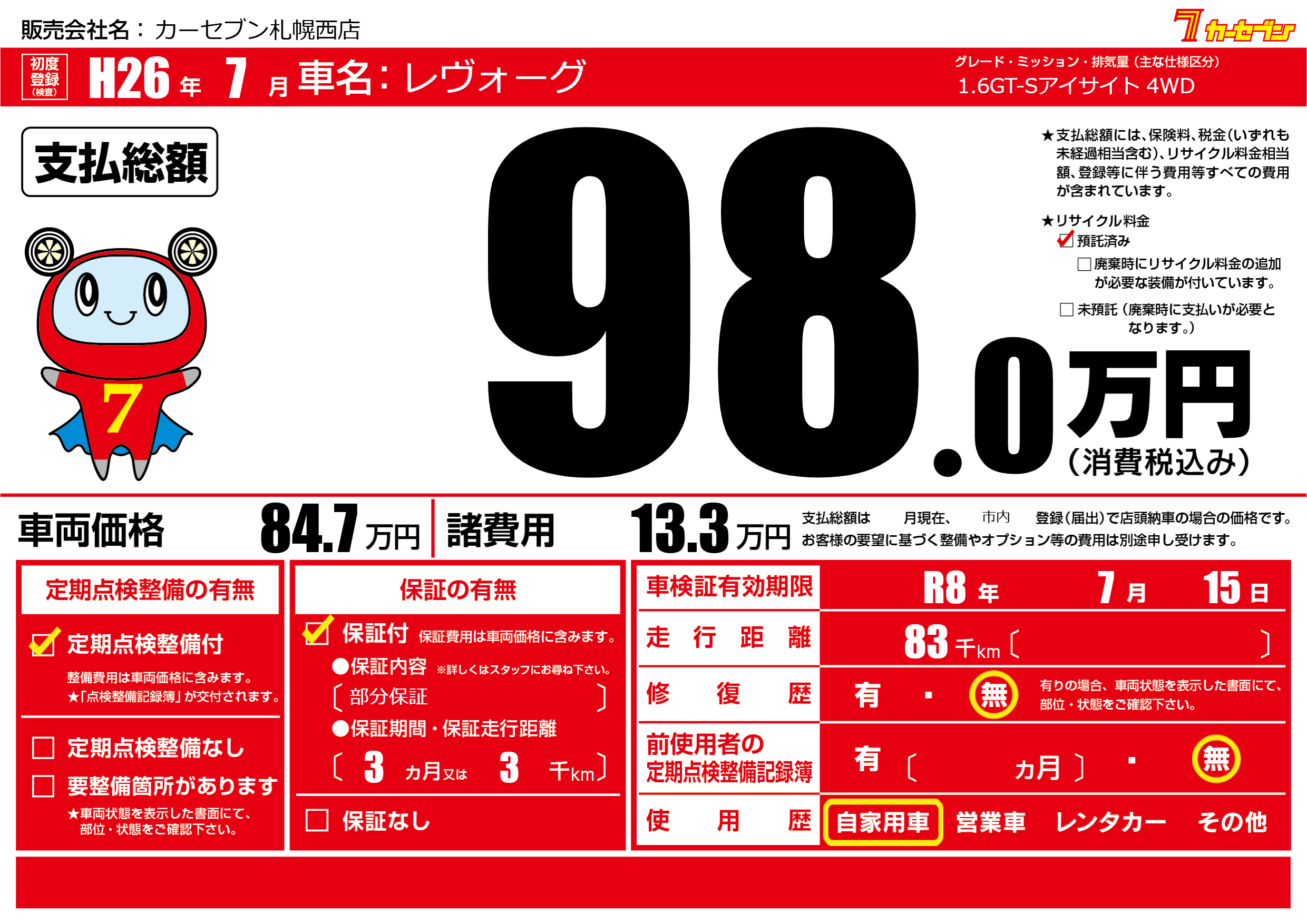 | 走行キロ | 8.3万km | 初年度登録 | H26年7月 |