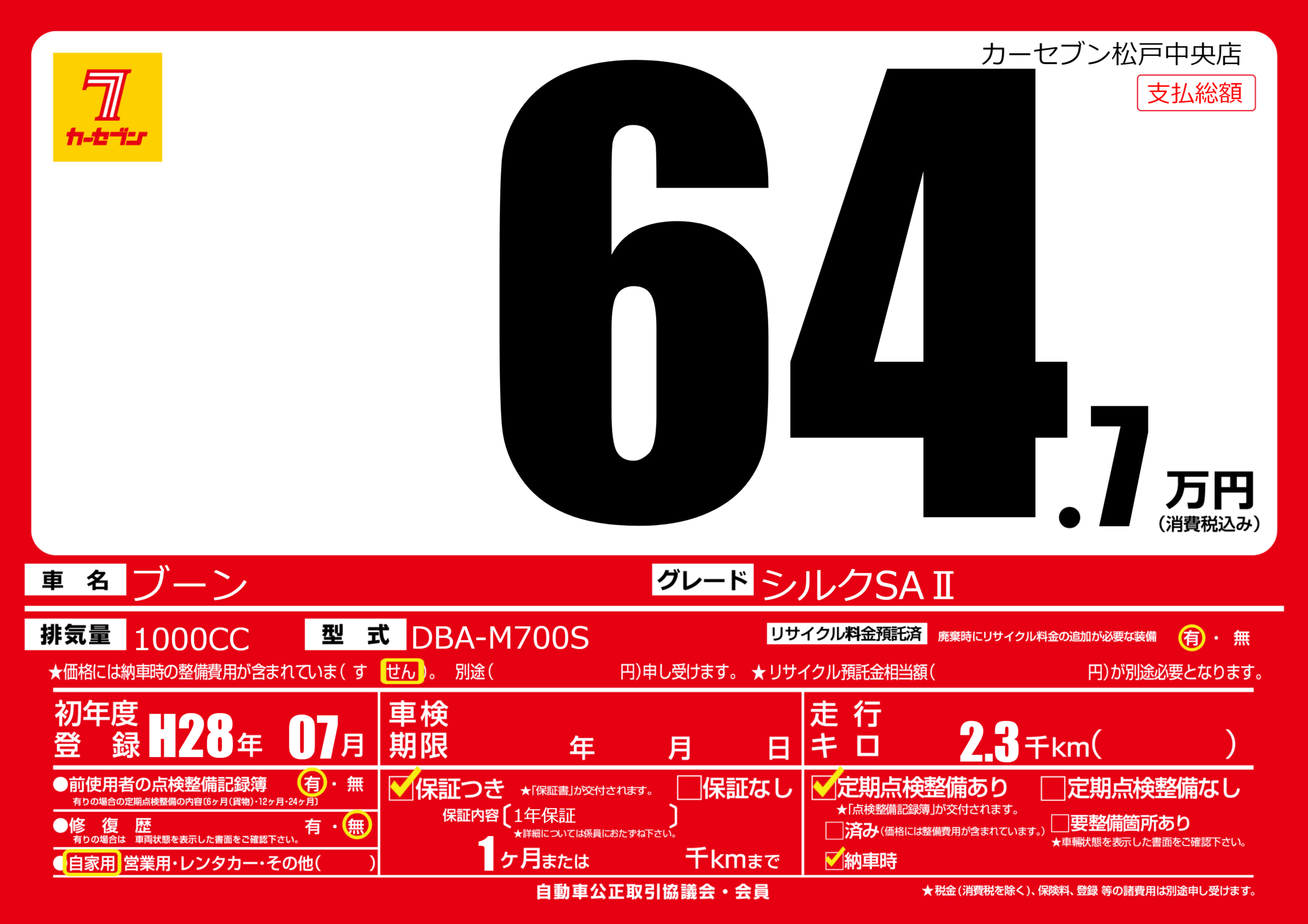 | 走行キロ | 0.2万km | 初年度登録 | H28年07月 |