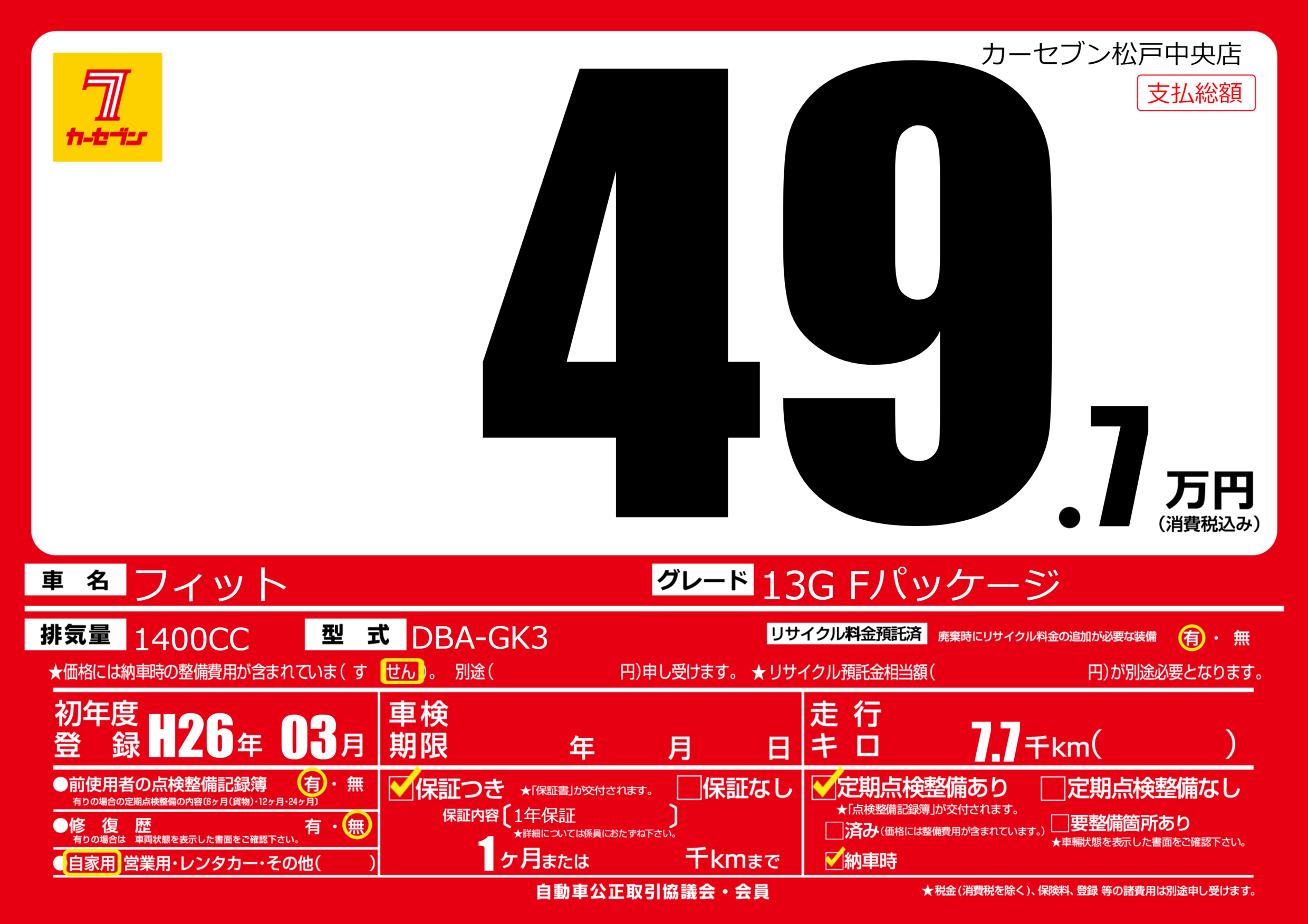 | 走行キロ | 0.7万km | 初年度登録 | H26年03月 |