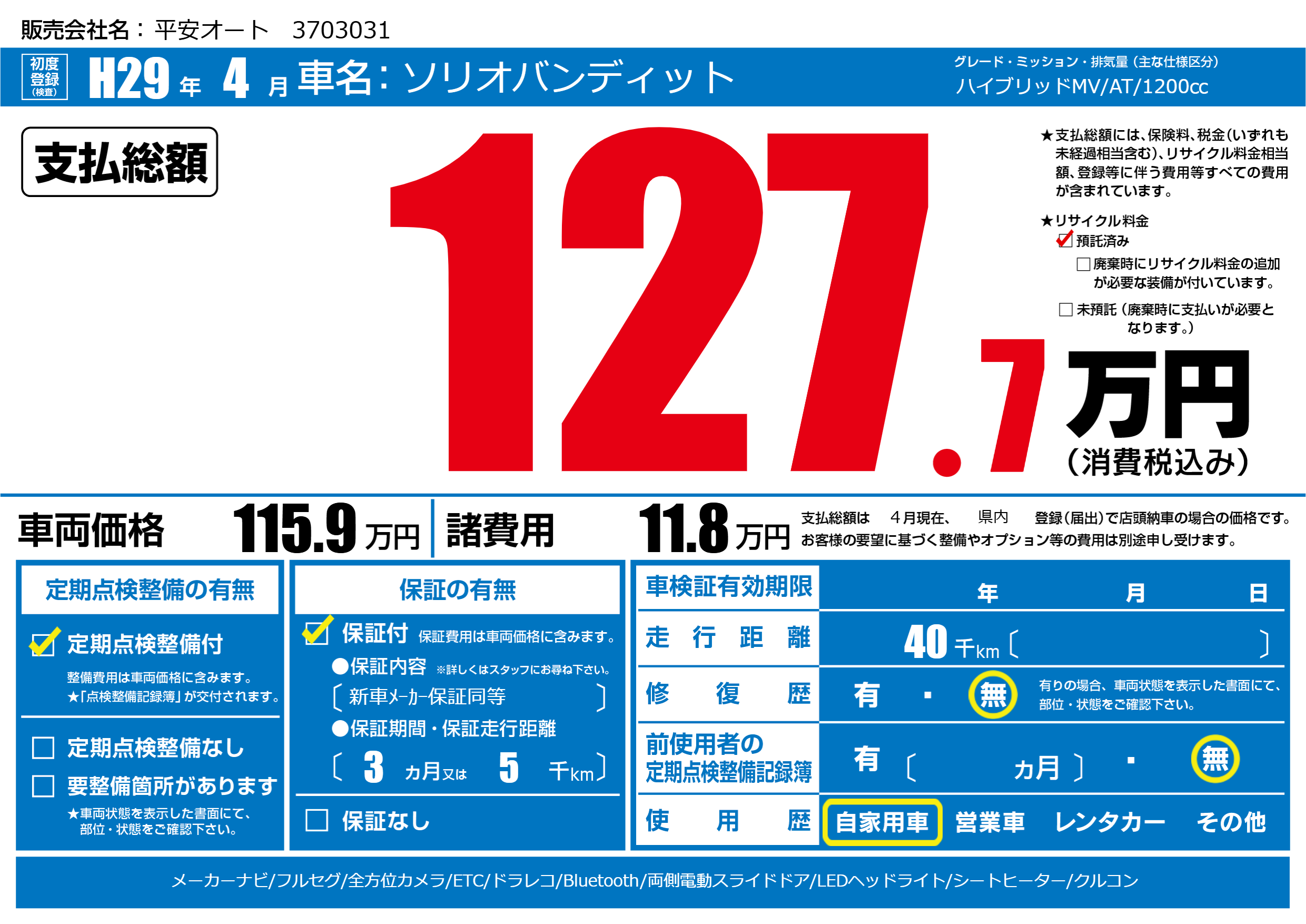 | 走行キロ | 4万km | 初年度登録 | H29年4月 |