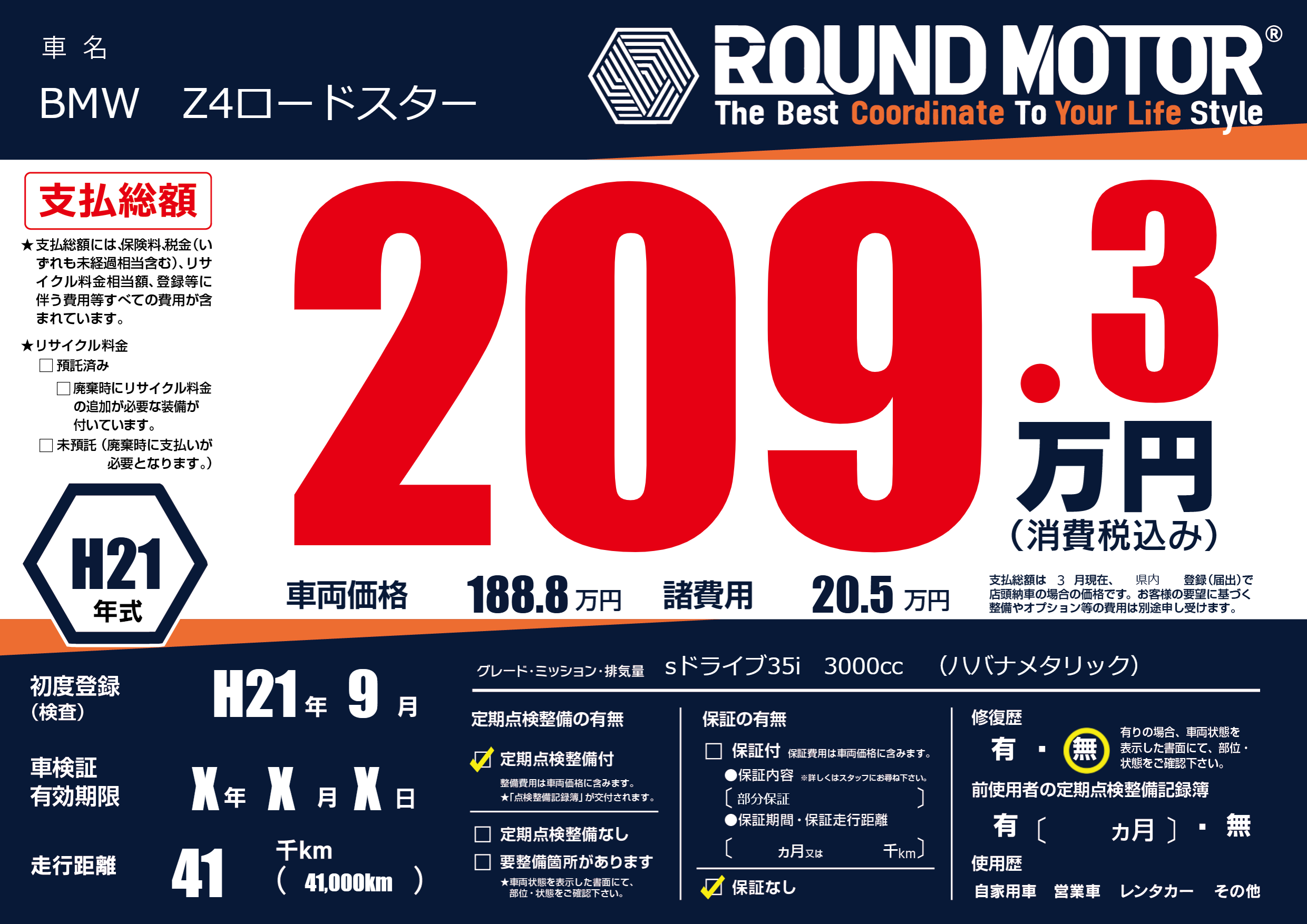 | 車名 | BMW Z4ロードスター | グレード ミッション 排気量 |