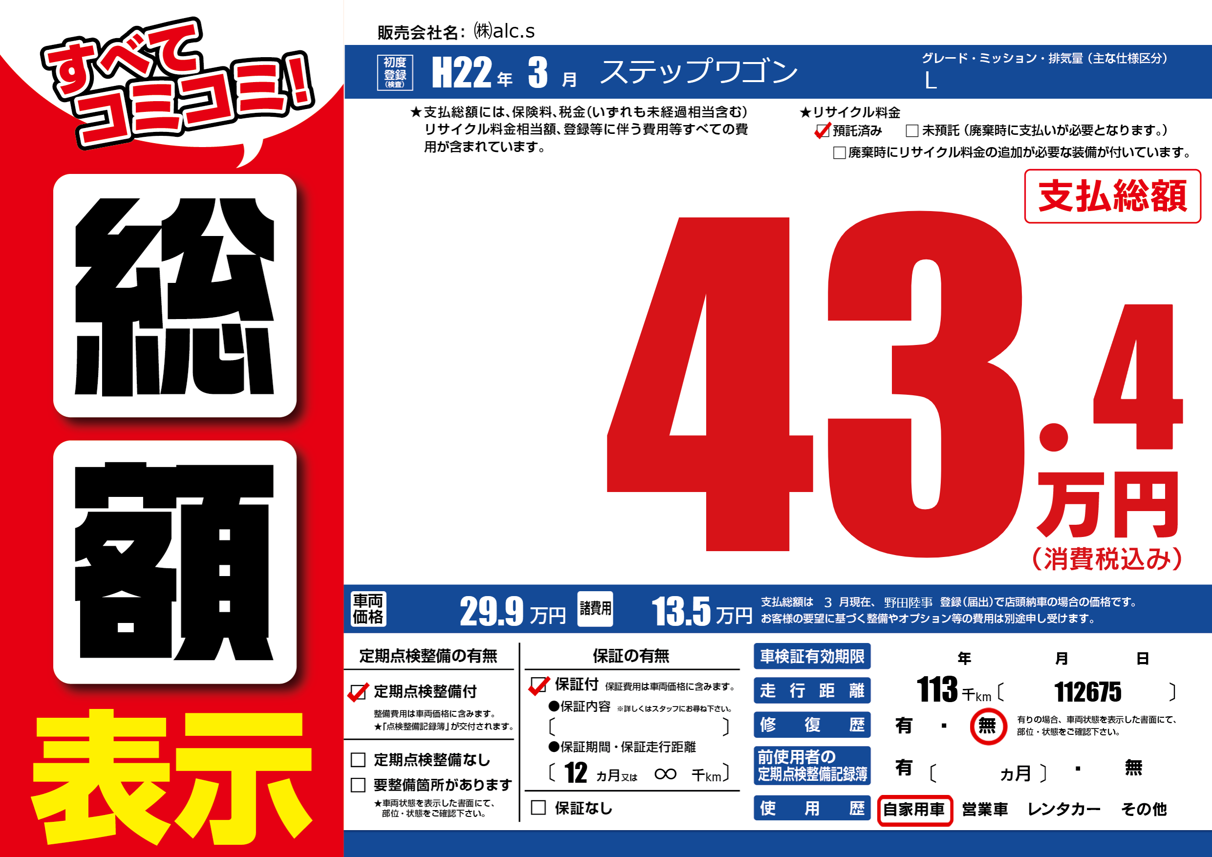 | 走行キロ | 11.3万km | 初年度登録 | H22年3月 |