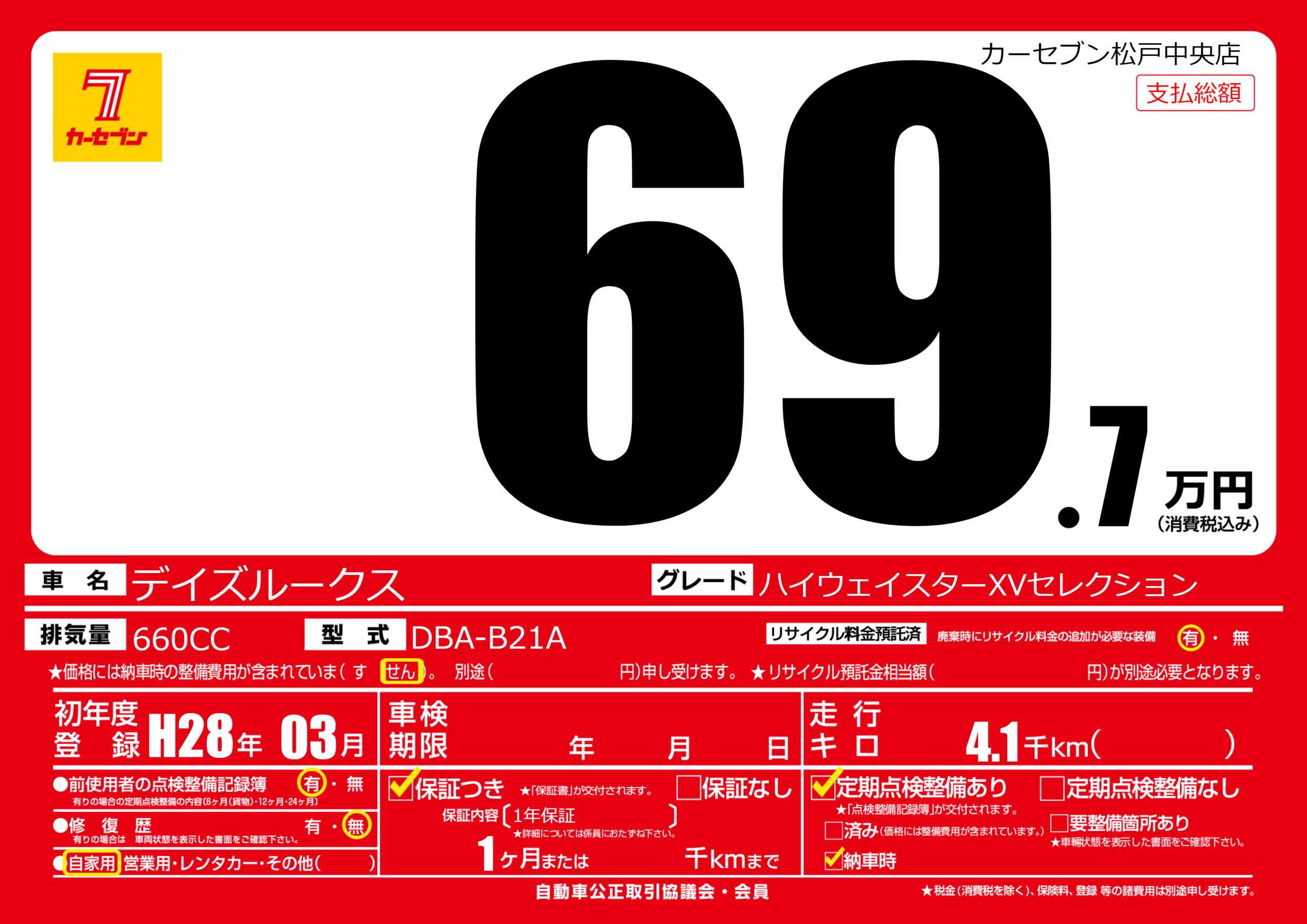 | 走行キロ | 0.4万km | 初年度登録 | H28年03月 |