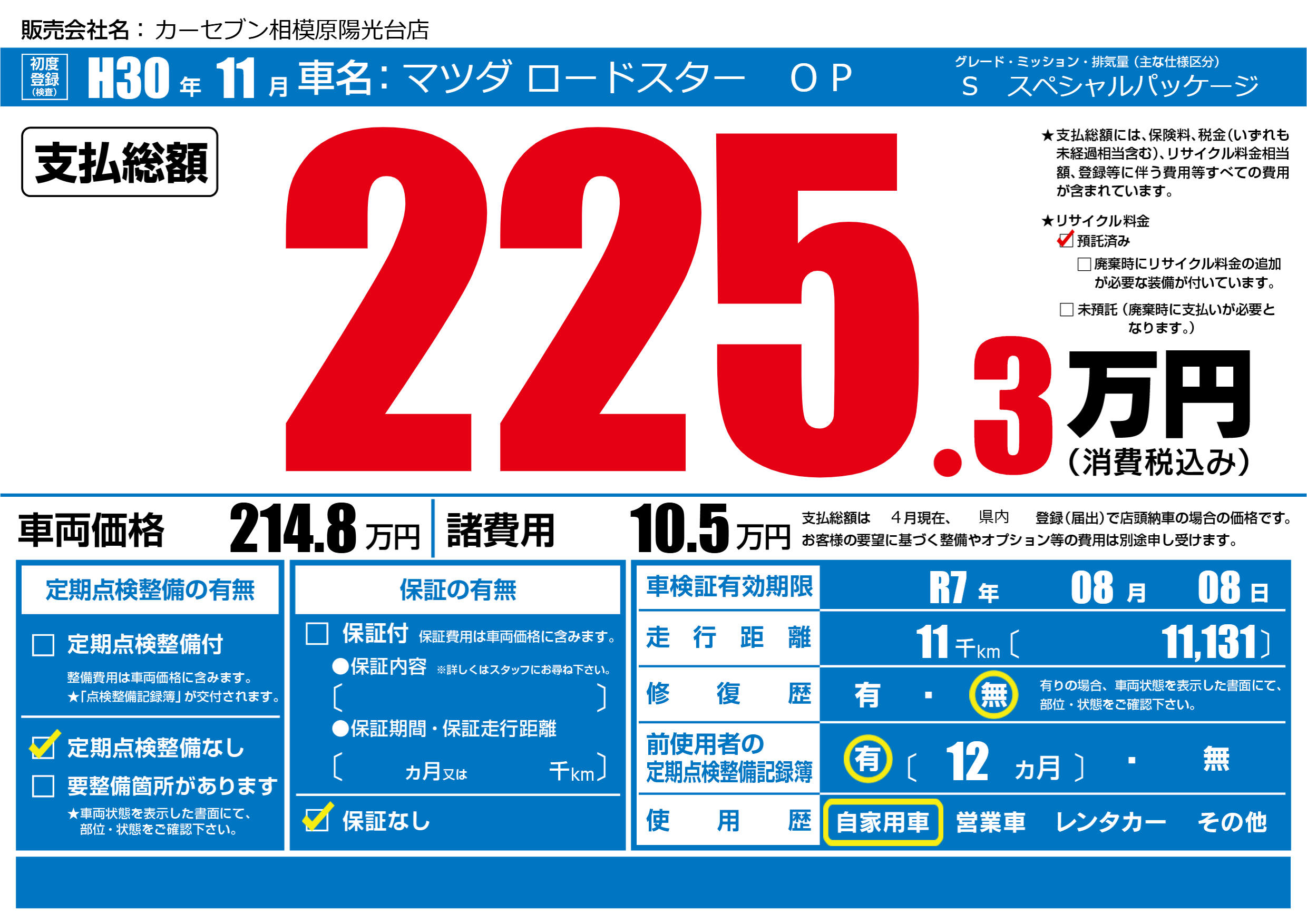 | 車名 | マツダ ロードスター OP | グレード ミッション 排気量 |