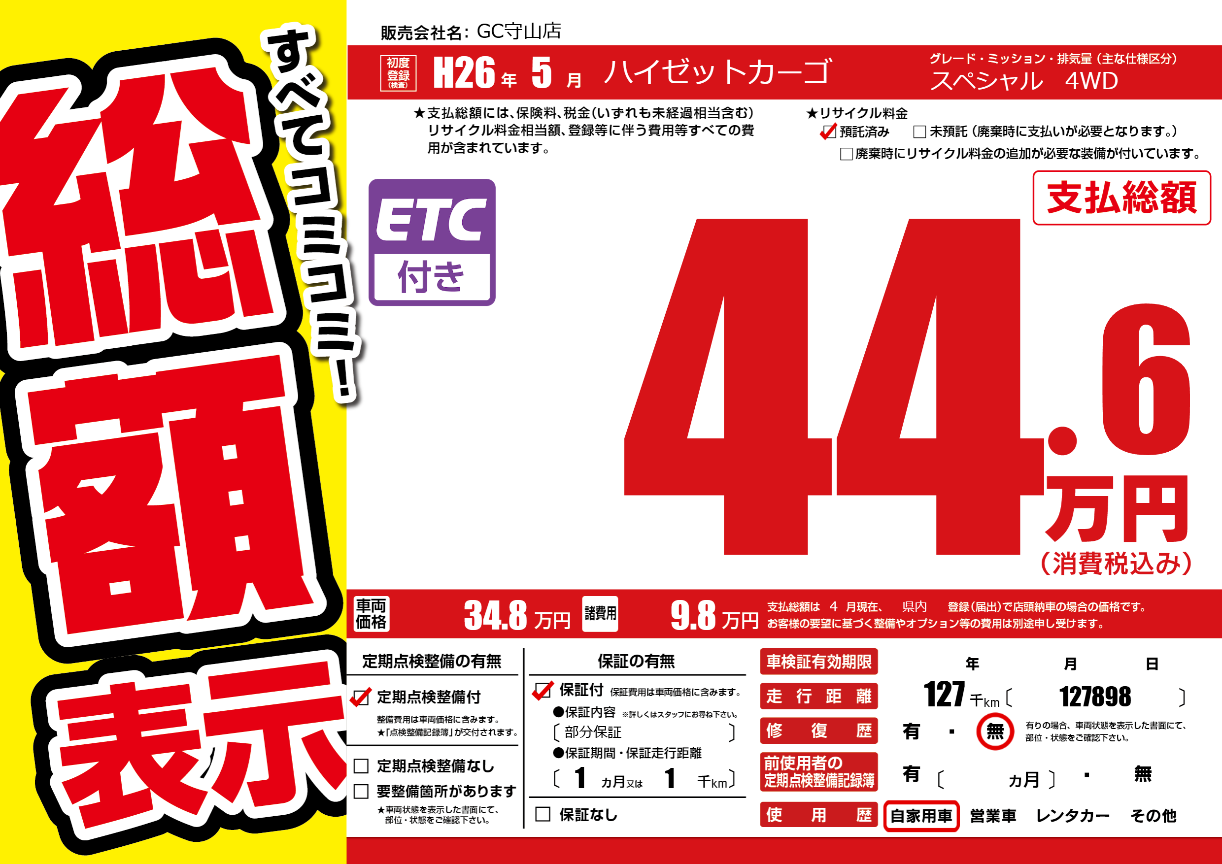 | 車名 | ハイゼットカーゴ | グレード ミッション 排気量 |