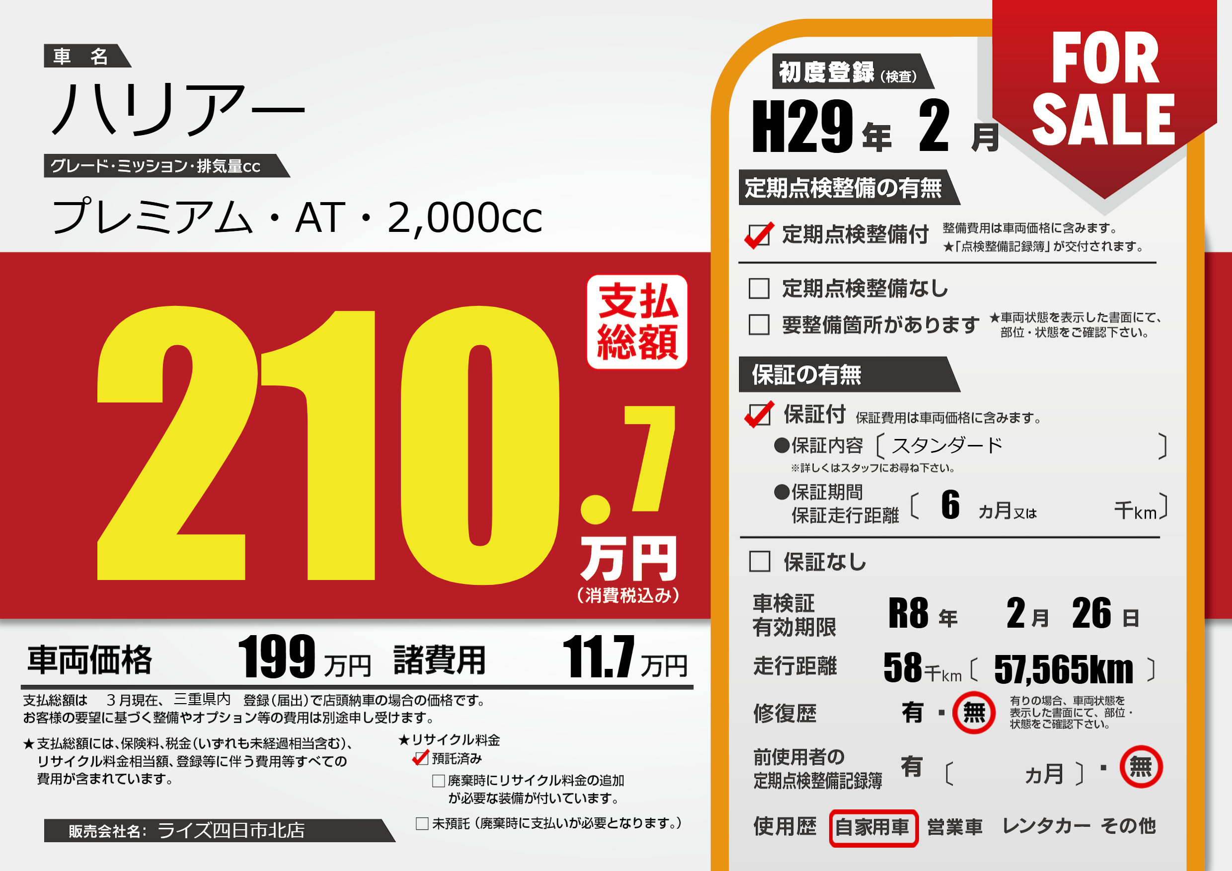 | 車名 | ハリアー | グレード ミッション 排気量 |