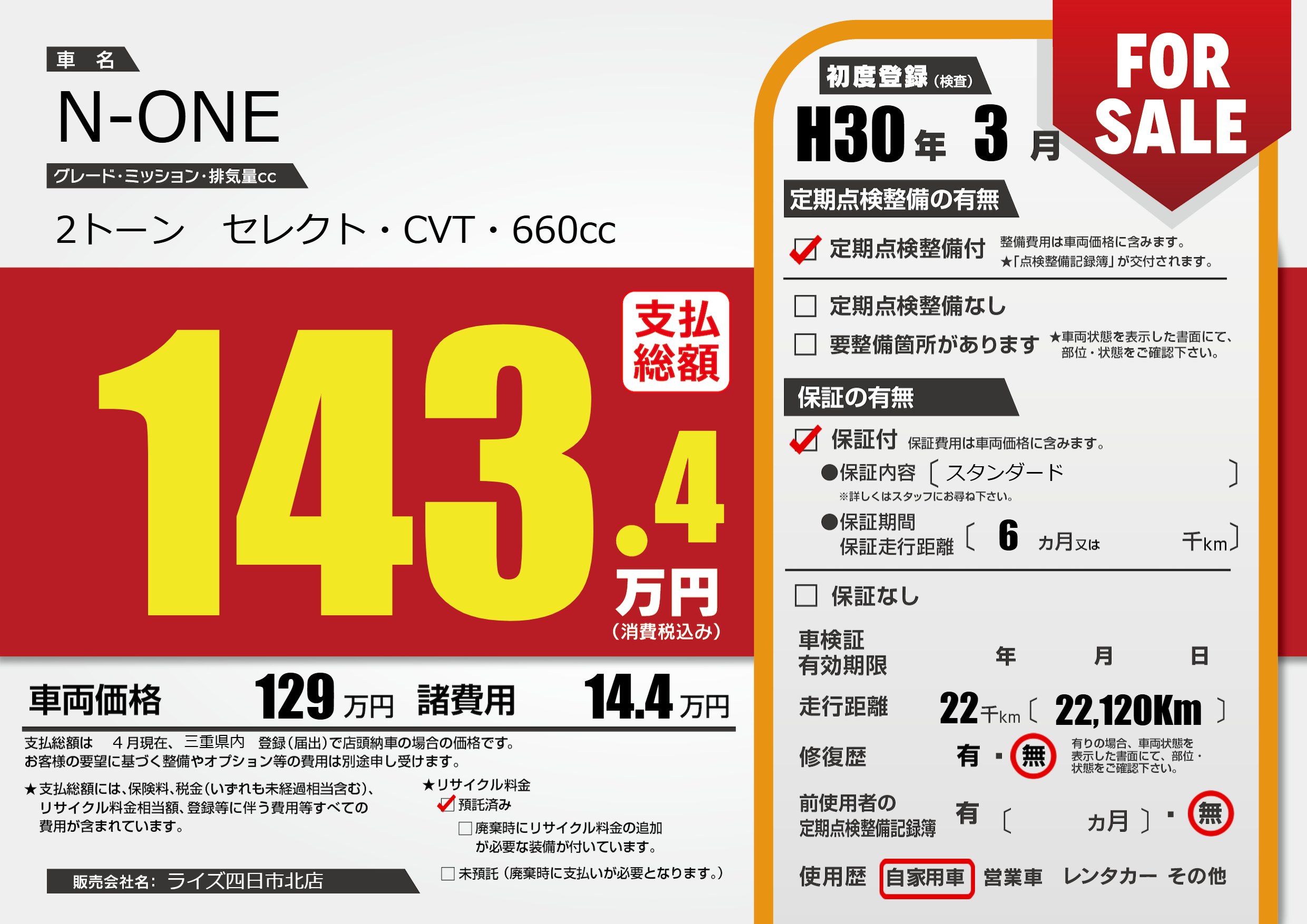 | 車名 | N-ONE | グレード ミッション 排気量 |