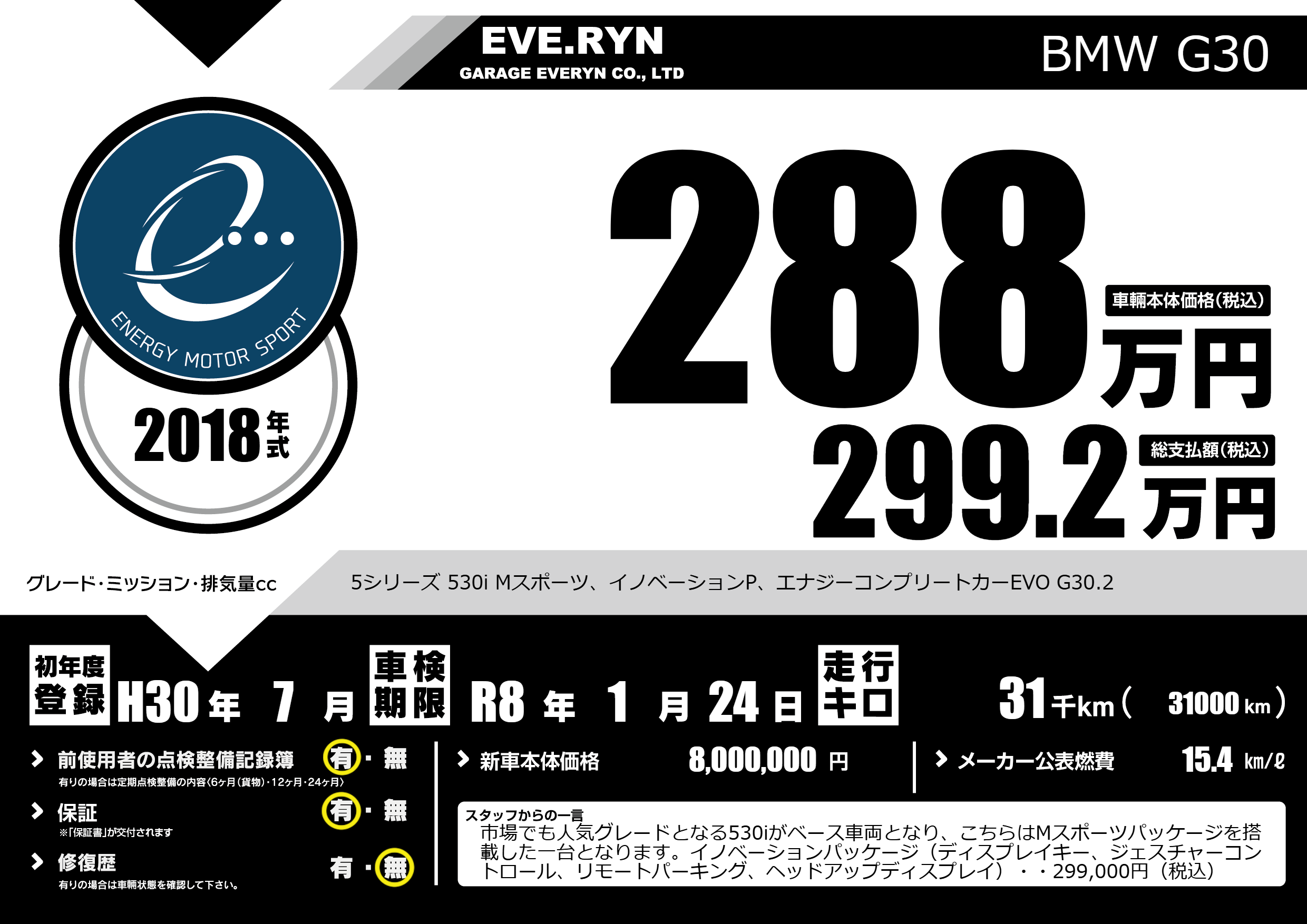 5シリーズ 530i Mスポーツ、イノベーションP、エナジーコンプリートカーEVO G30.2 |