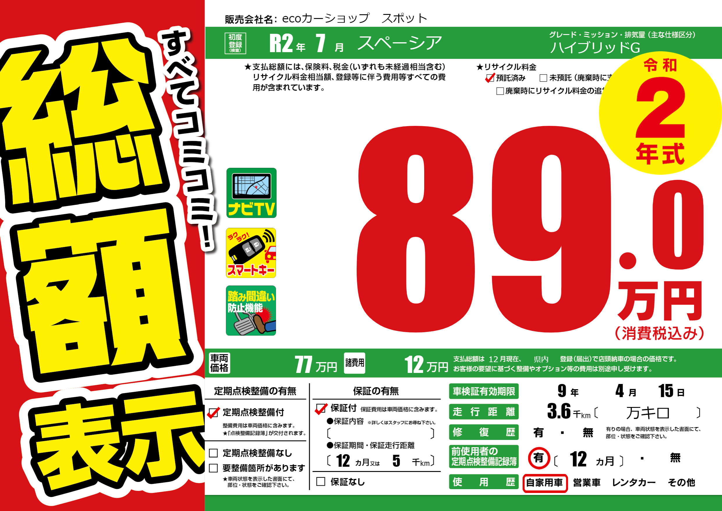 | 車名 | スペーシア | グレード ミッション 排気量 |