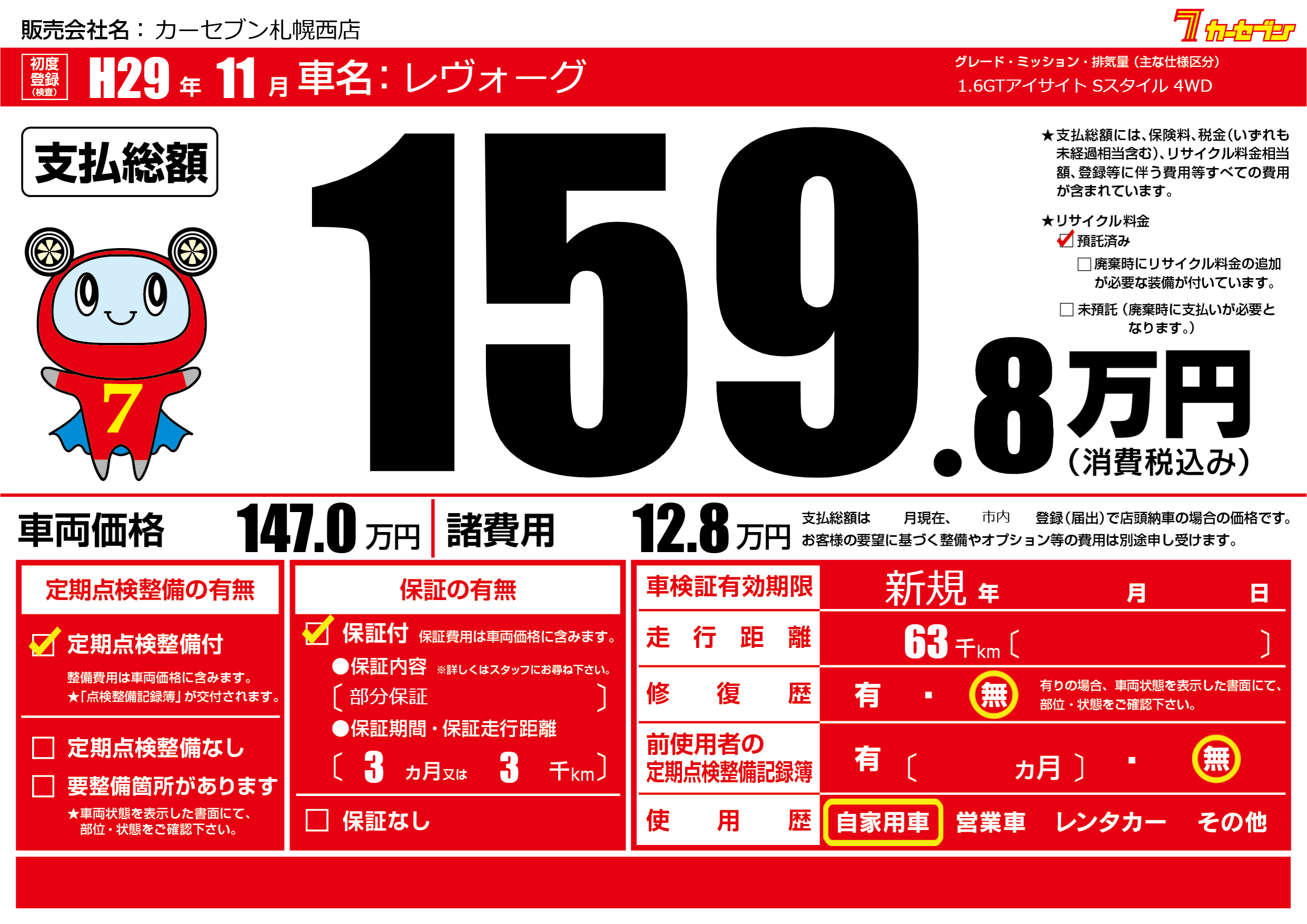 | 車名 | レヴォーグ | グレード ミッション 排気量 |