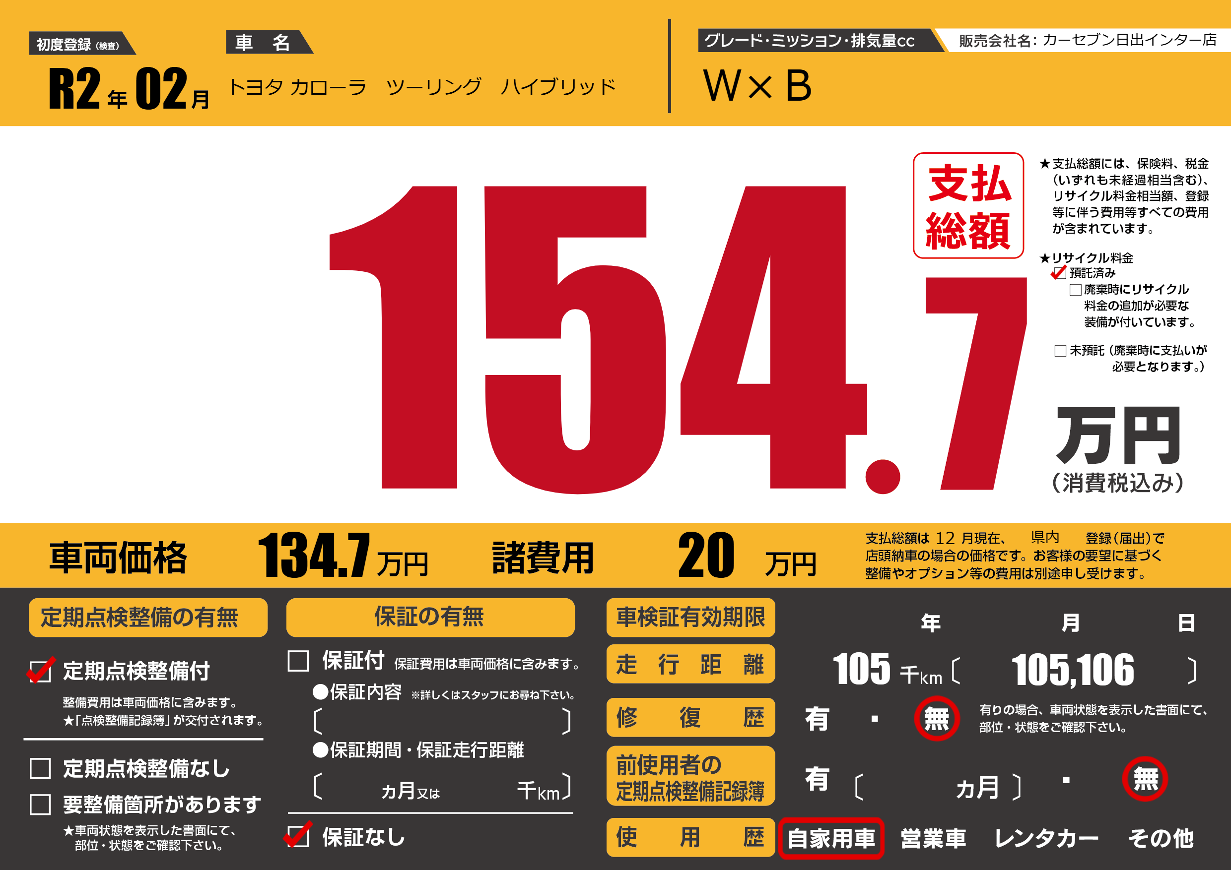 | 走行キロ | 10.5万km | 初年度登録 | R2年02月 |