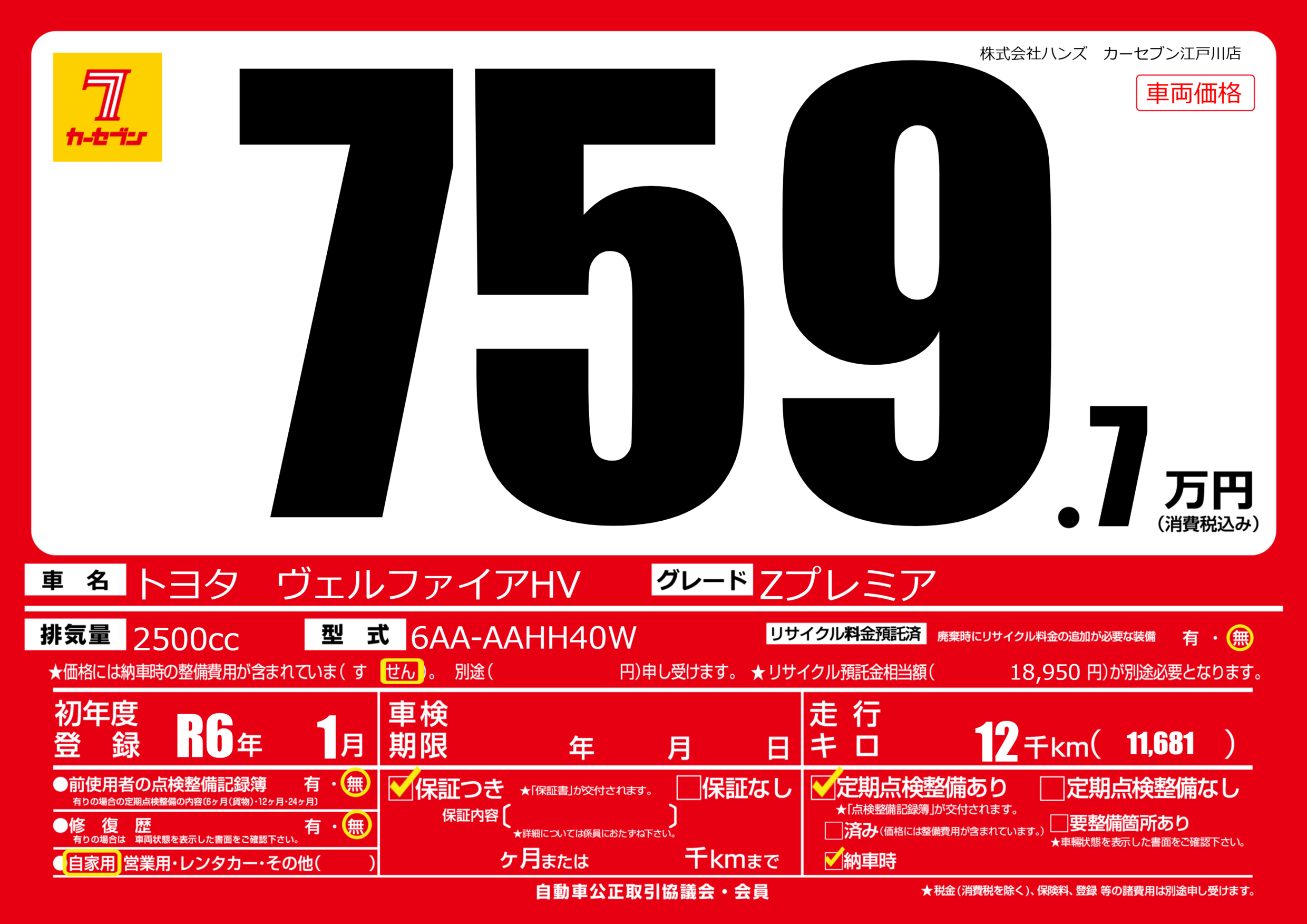 | 車名 | トヨタ ヴェルファイアHV | グレード ミッション 排気量 |