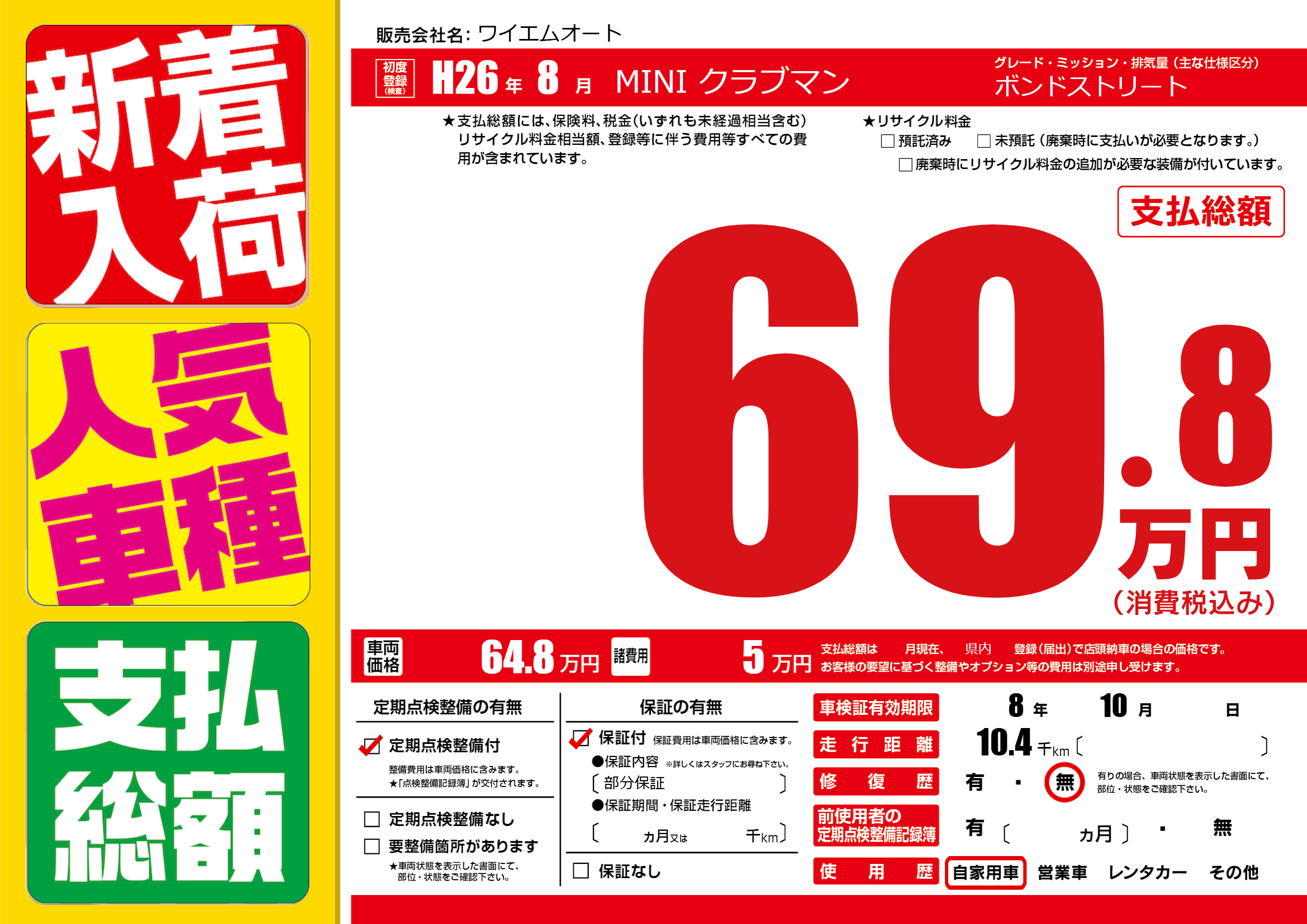 保証付き 保証内容(部分保証) ---ヶ月または()千kmまで |