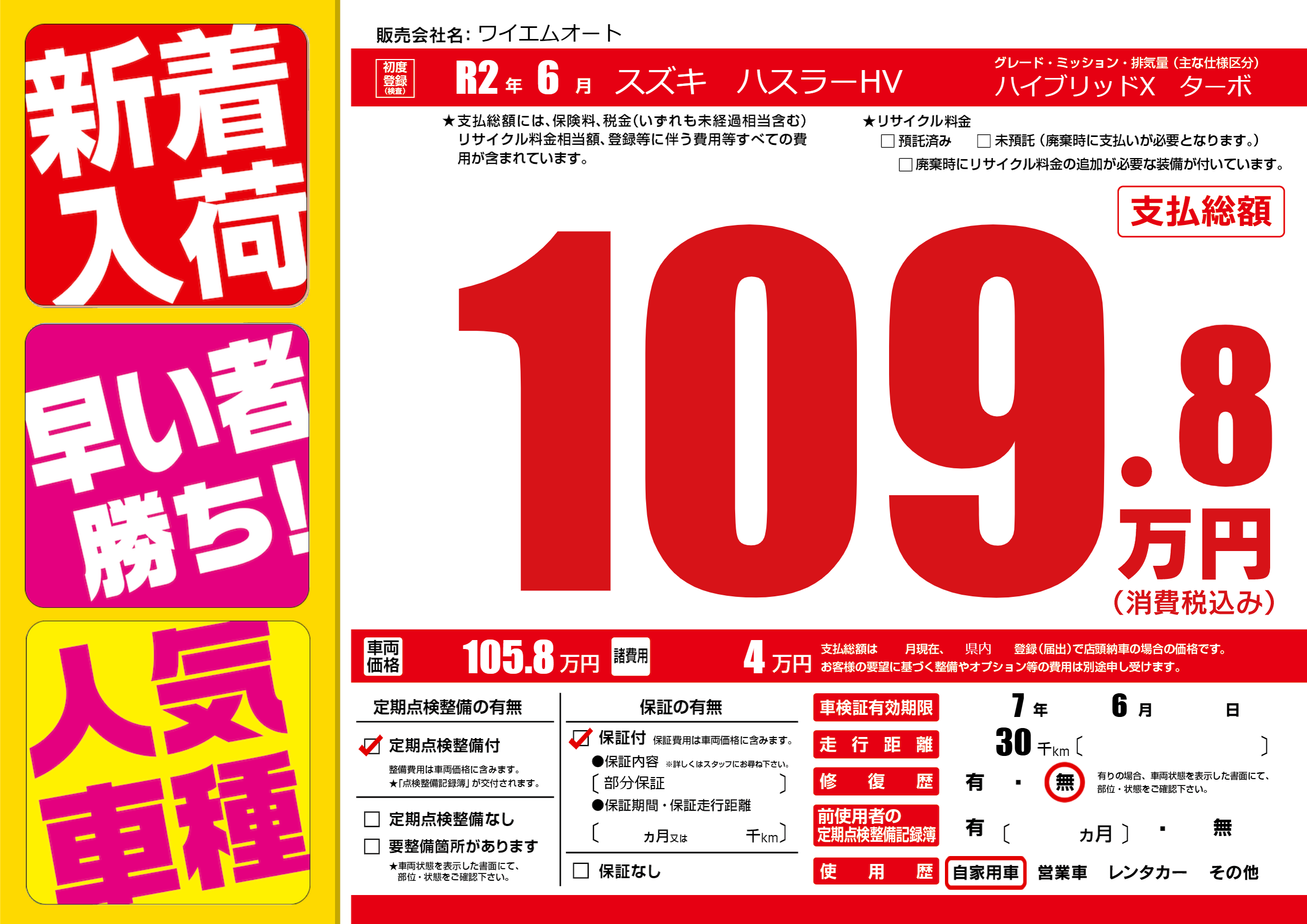 | 車名 | スズキ ハスラーHV | グレード ミッション 排気量 |