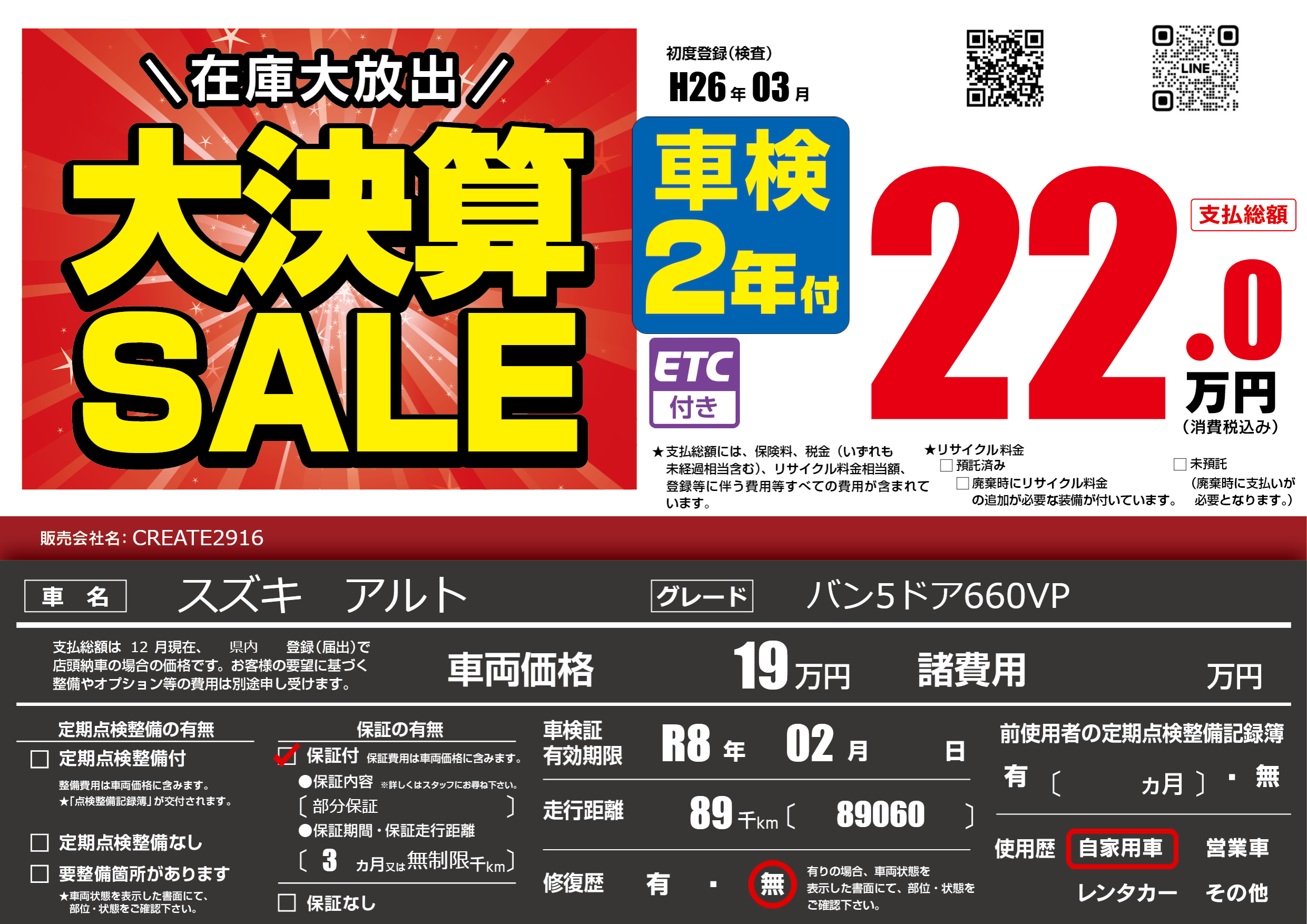 | 車検制限 | R8年 02月 - 日 | ||