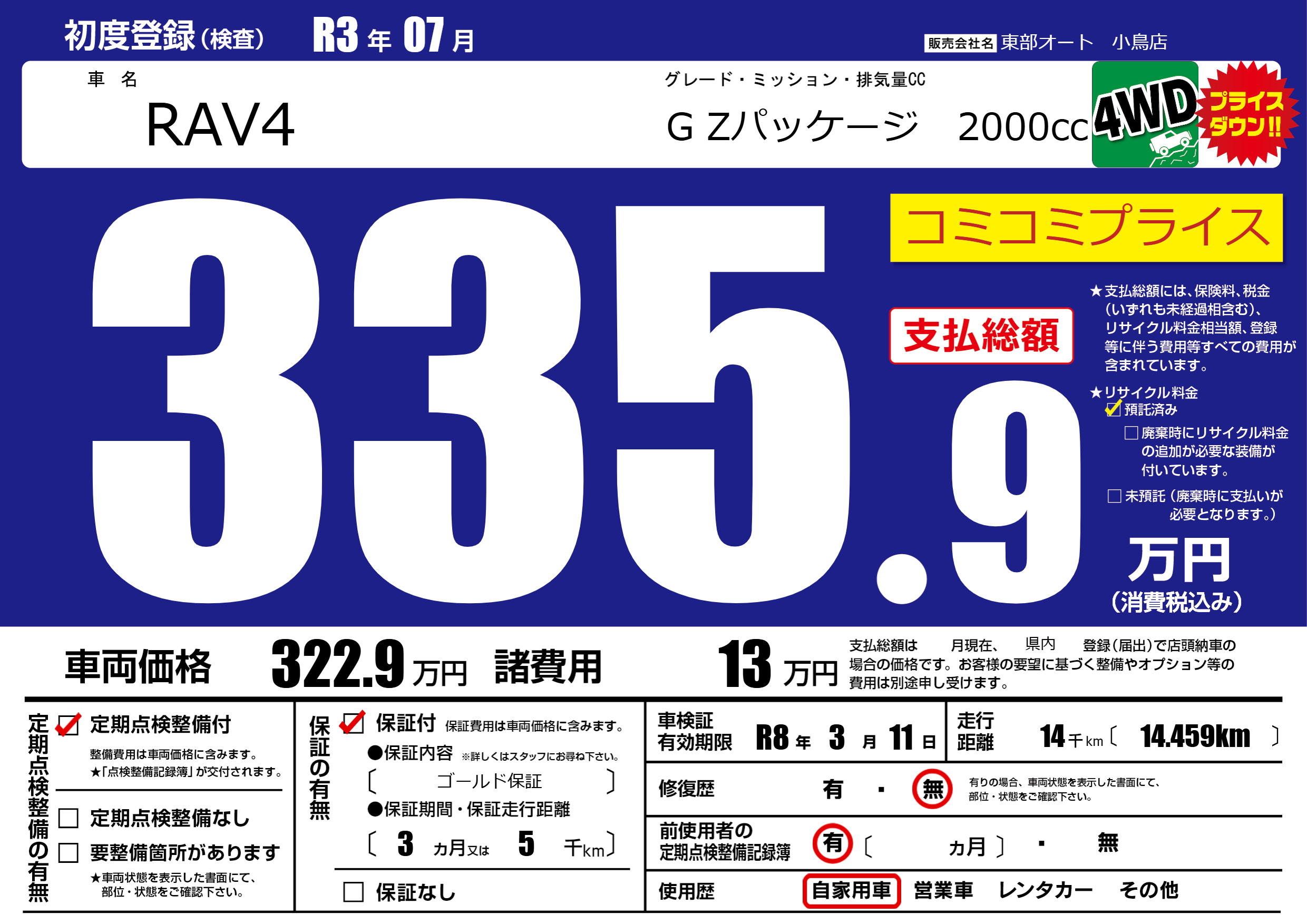 | 車名 | RAV4 | グレード ミッション 排気量 |