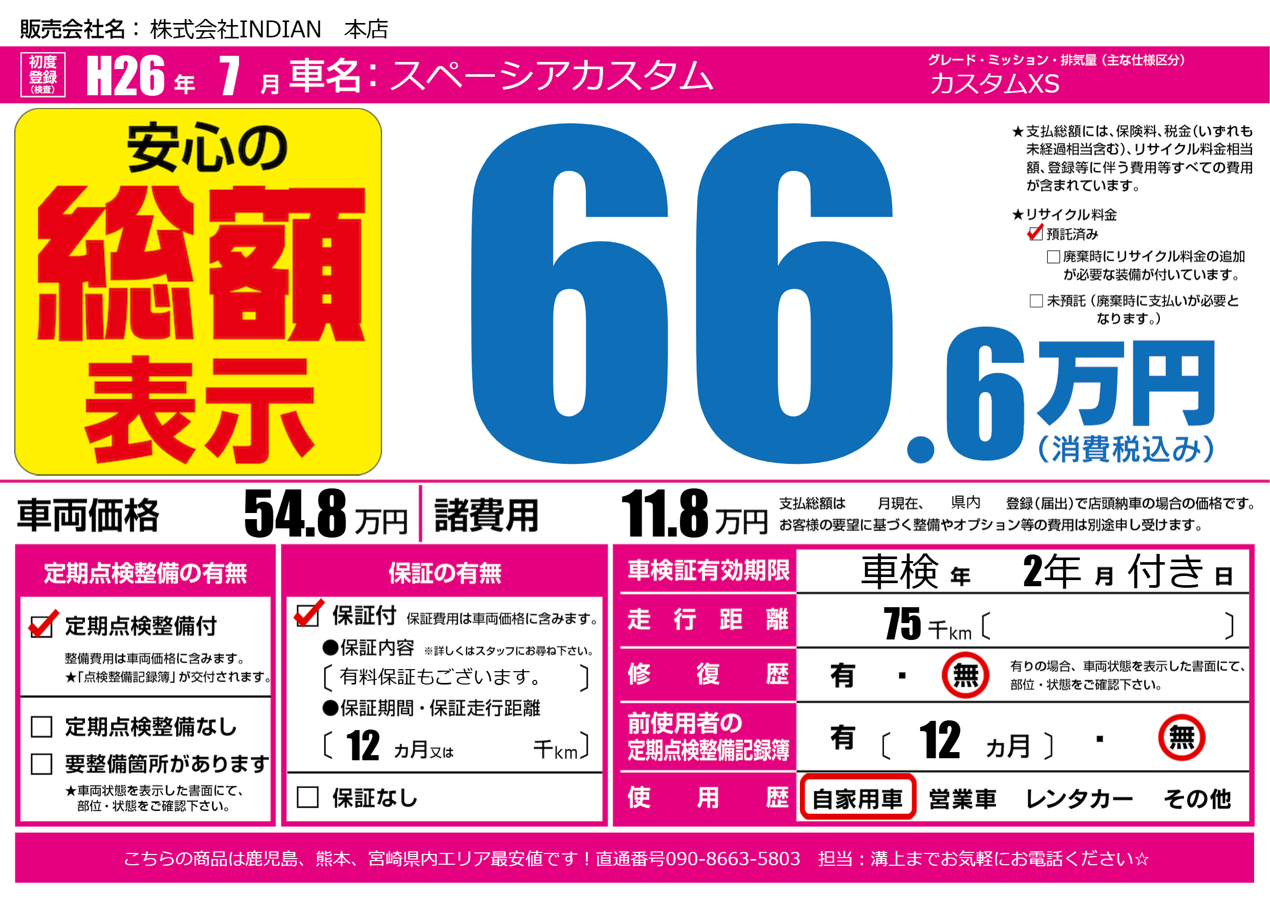 | 車名 | スペーシアカスタム | グレード ミッション 排気量 |
