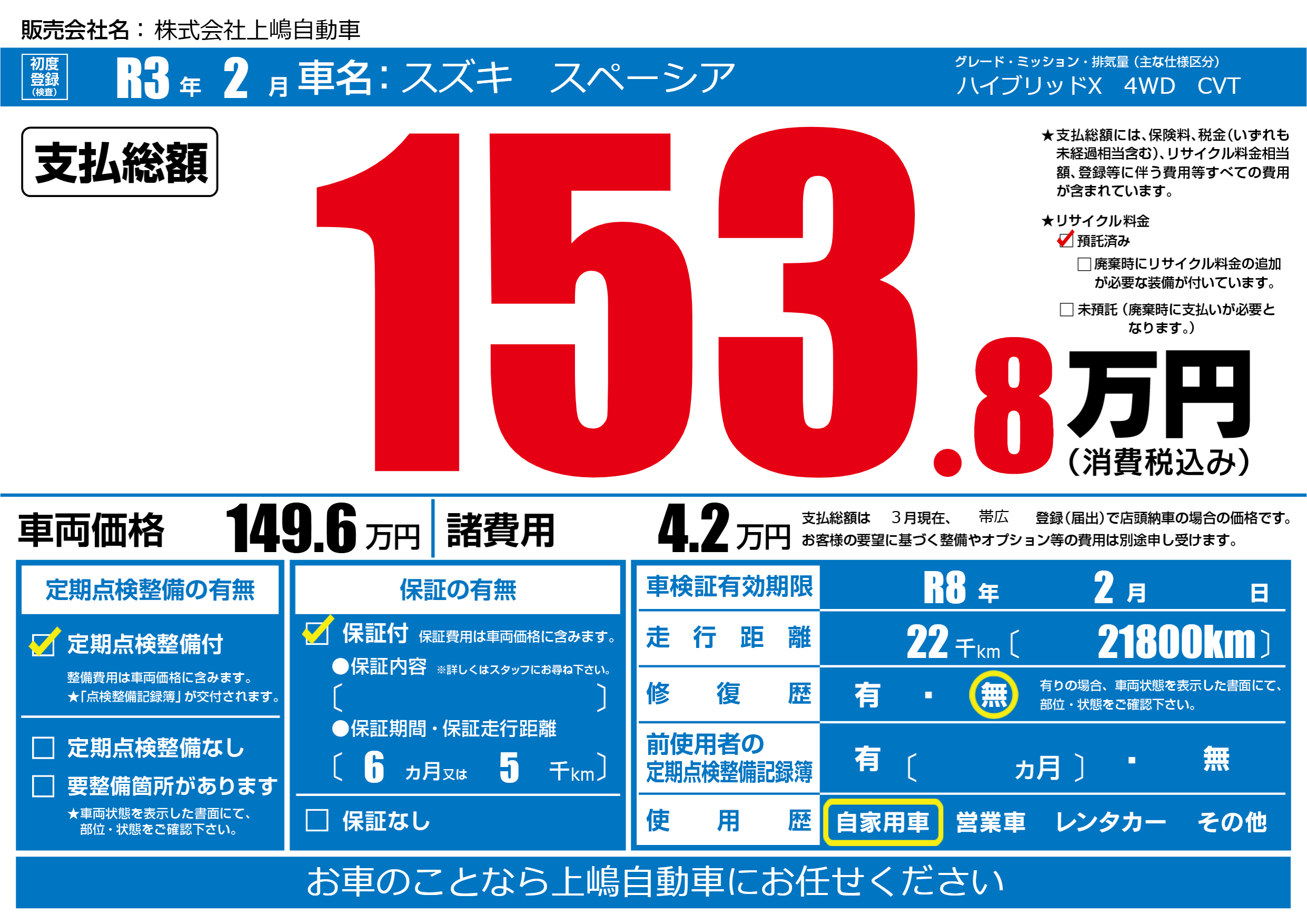 | 車名 | スズキ スペーシア | グレード ミッション 排気量 |