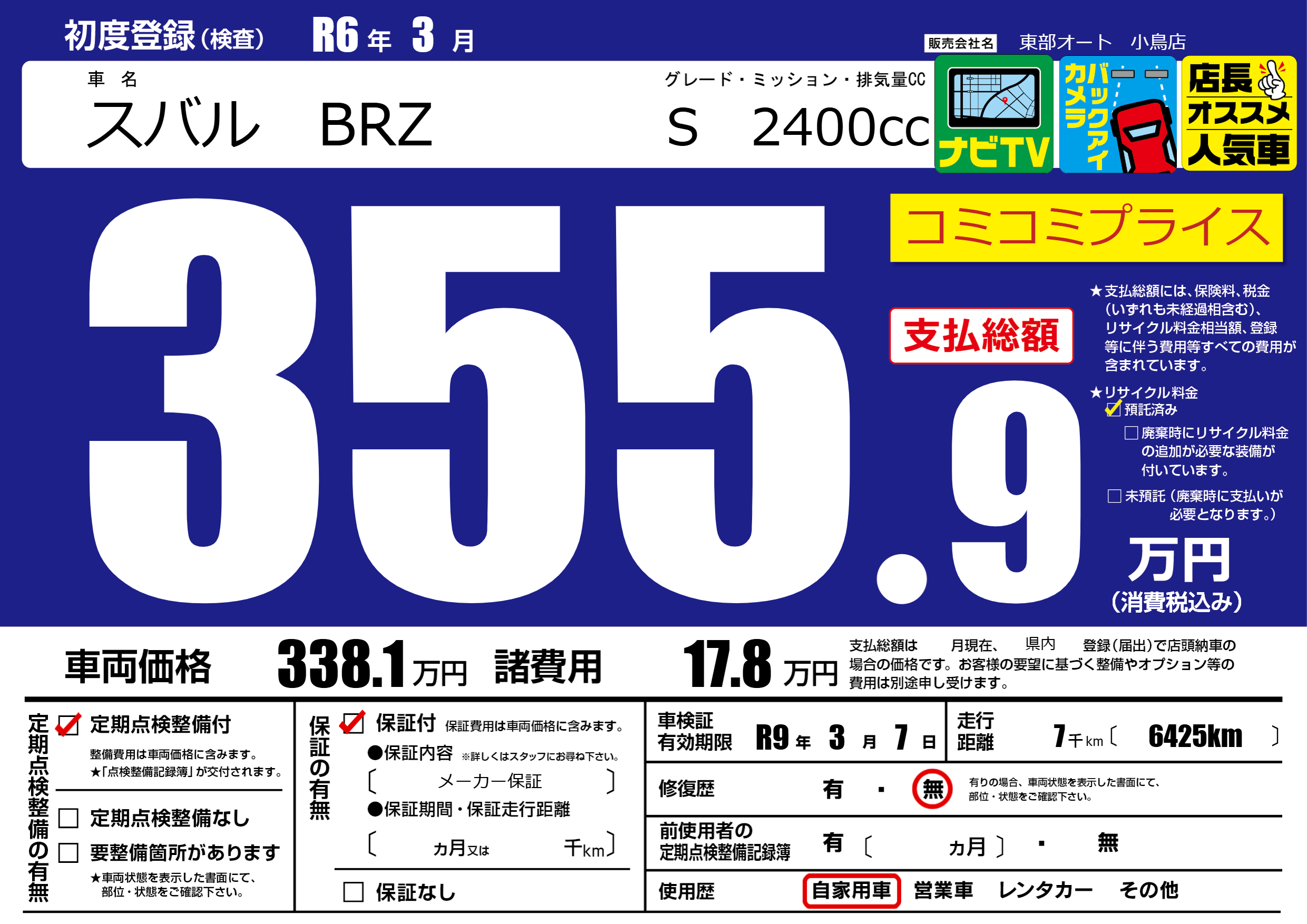 | 車名 | スバル BRZ | グレード ミッション 排気量 |
