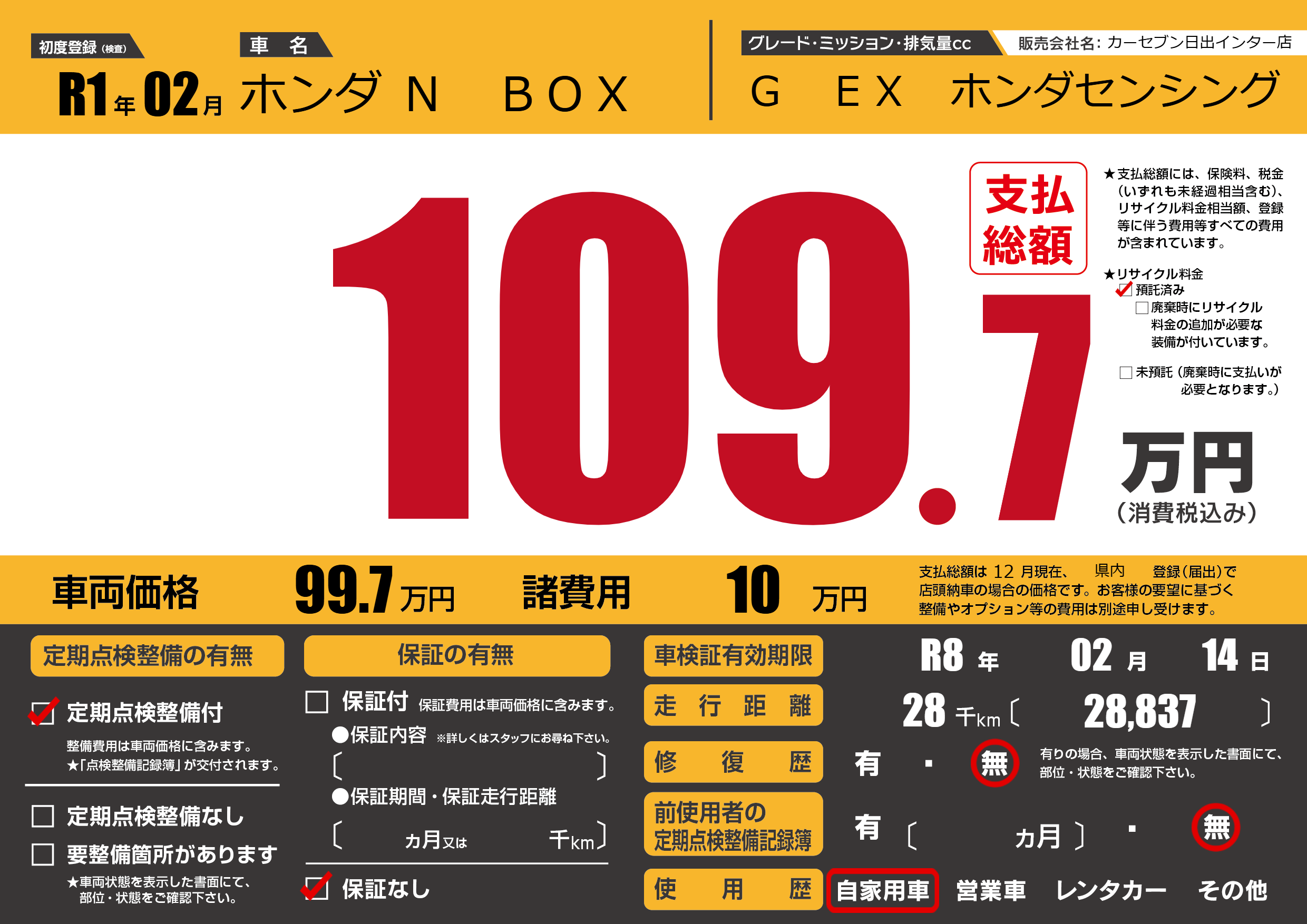 | 車名 | ホンダ N BOX | グレード ミッション 排気量 |