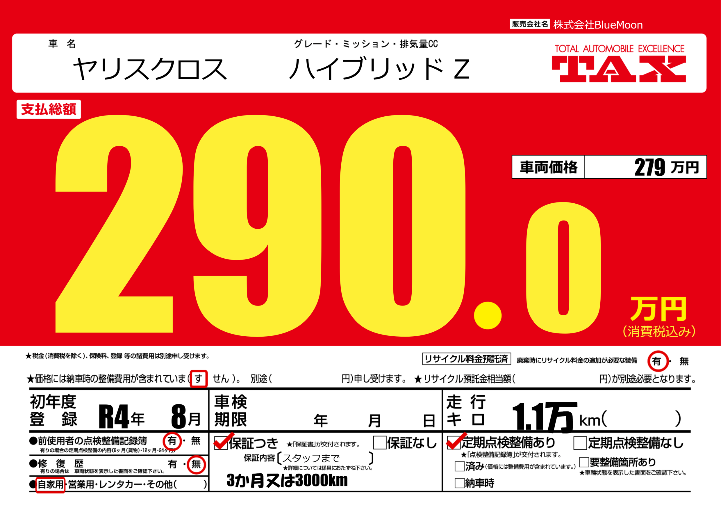 | 車名 | ヤリスクロス | グレード ミッション 排気量 |