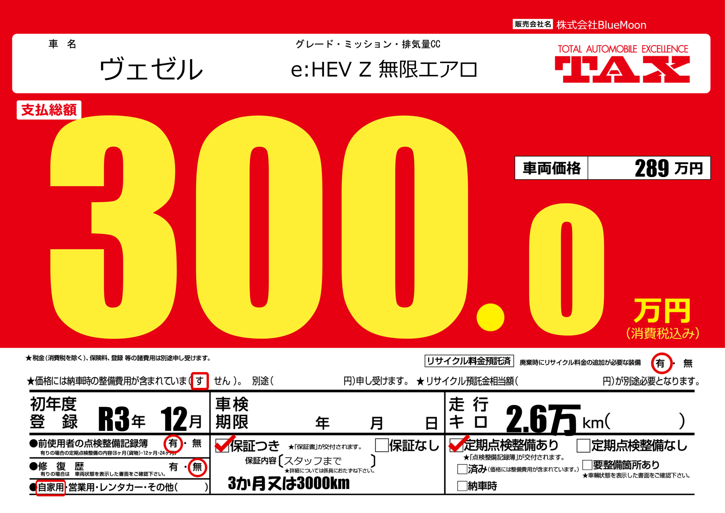 保証付き 保証内容(スタッフまで) ---ヶ月または()千kmまで |