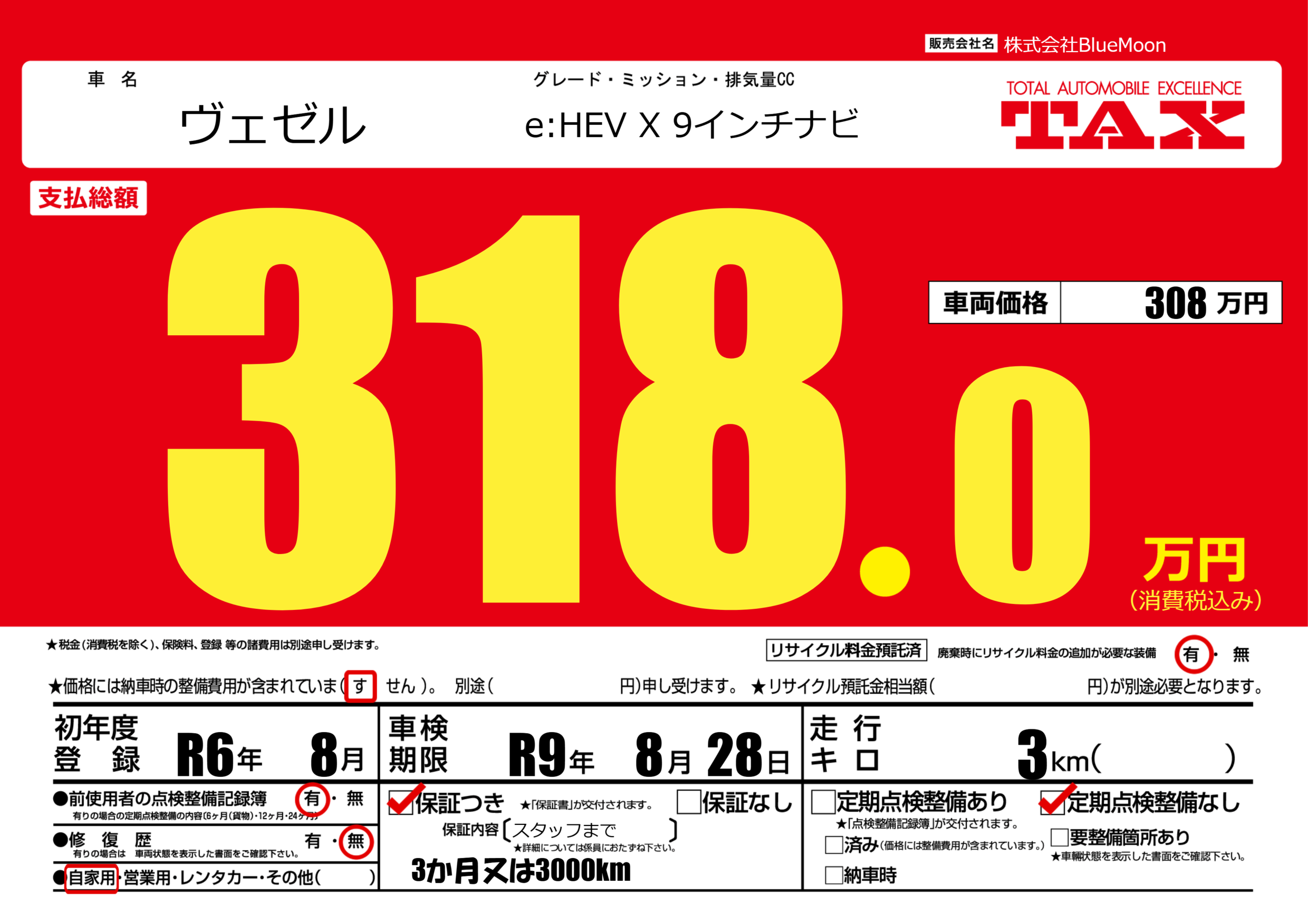 | 走行キロ | 0.3万km | 初年度登録 | R6年8月 |