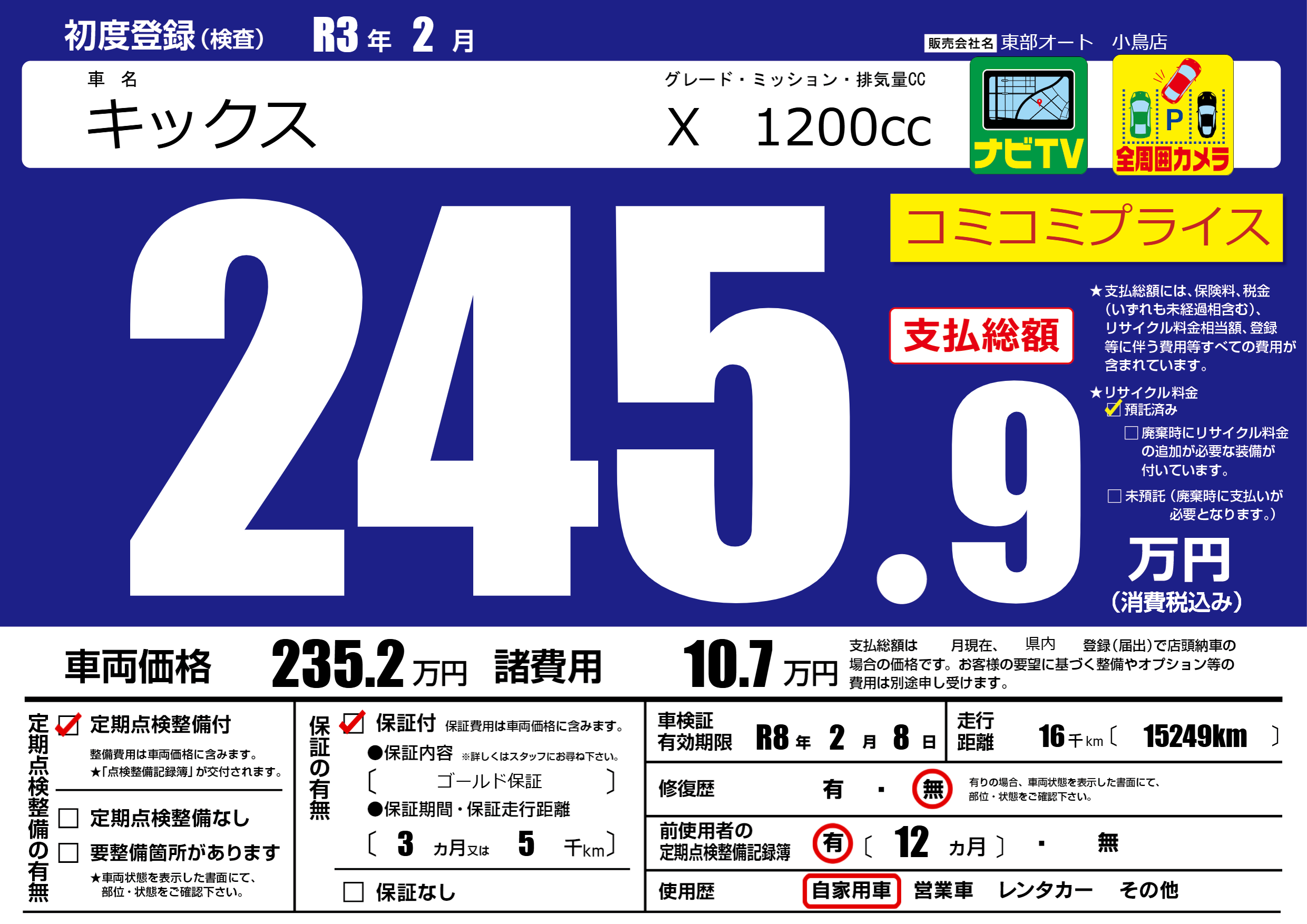 | 走行キロ | 1.6万km | 初年度登録 | R3年2月 |