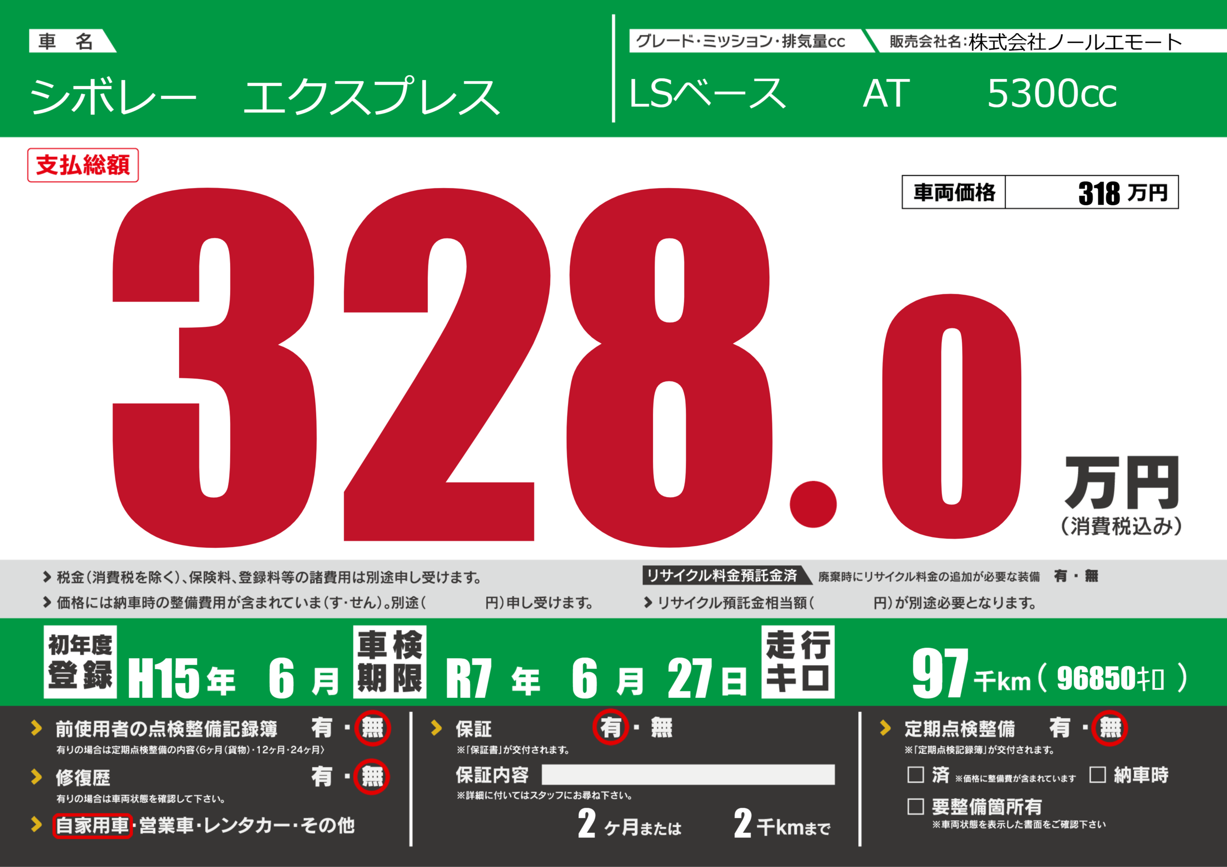 | 車名 | シボレー エクスプレス | グレード ミッション 排気量 |
