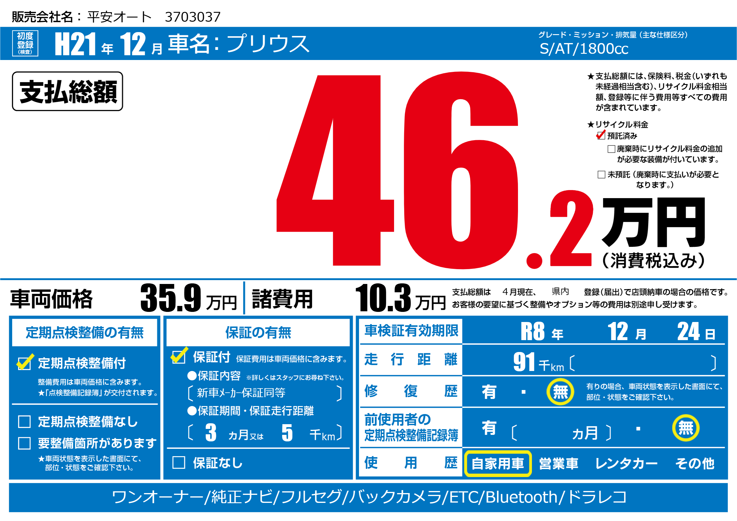 | 車名 | プリウス | グレード ミッション 排気量 |