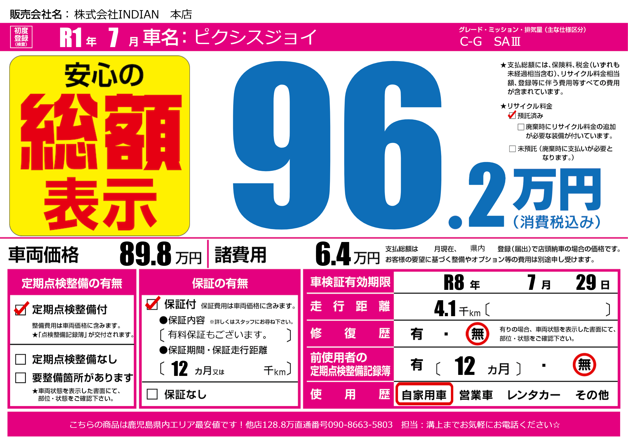 | 車検制限 | R8年 7月 29日 | ||
