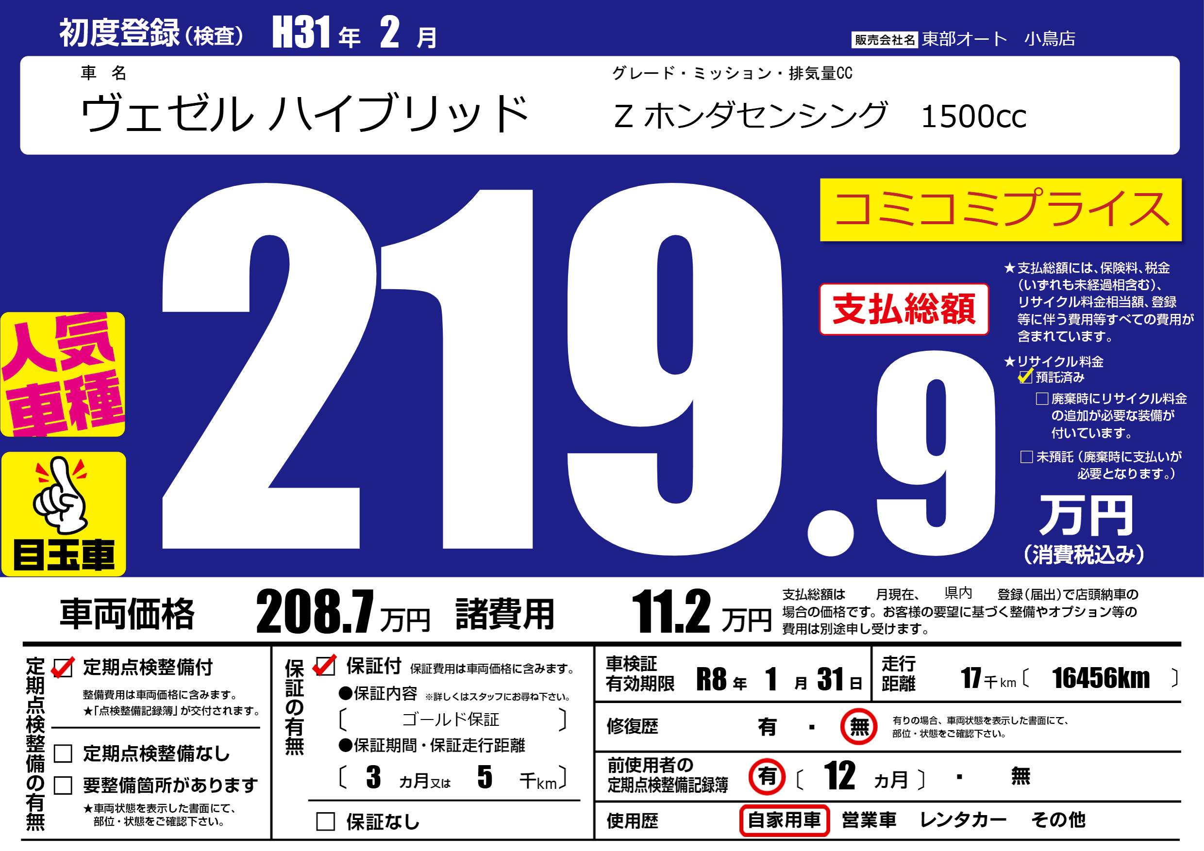 | 車名 | ヴェゼル ハイブリッド | グレード ミッション 排気量 |