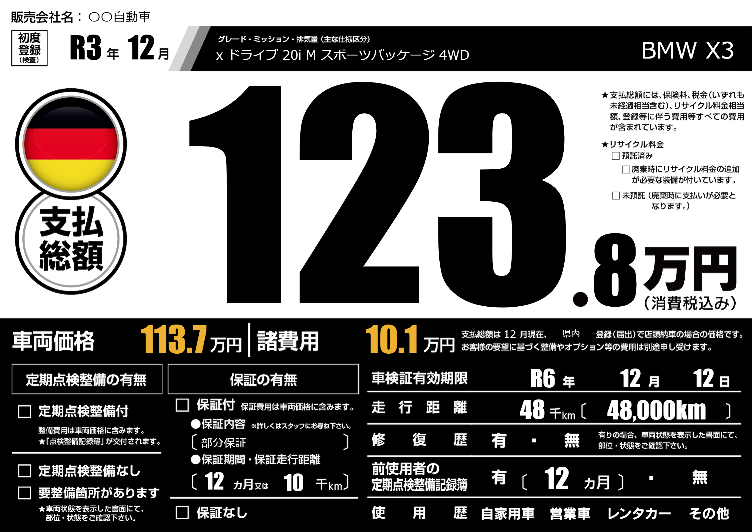 | 車名 | BMW X3 | グレード ミッション 排気量 |
