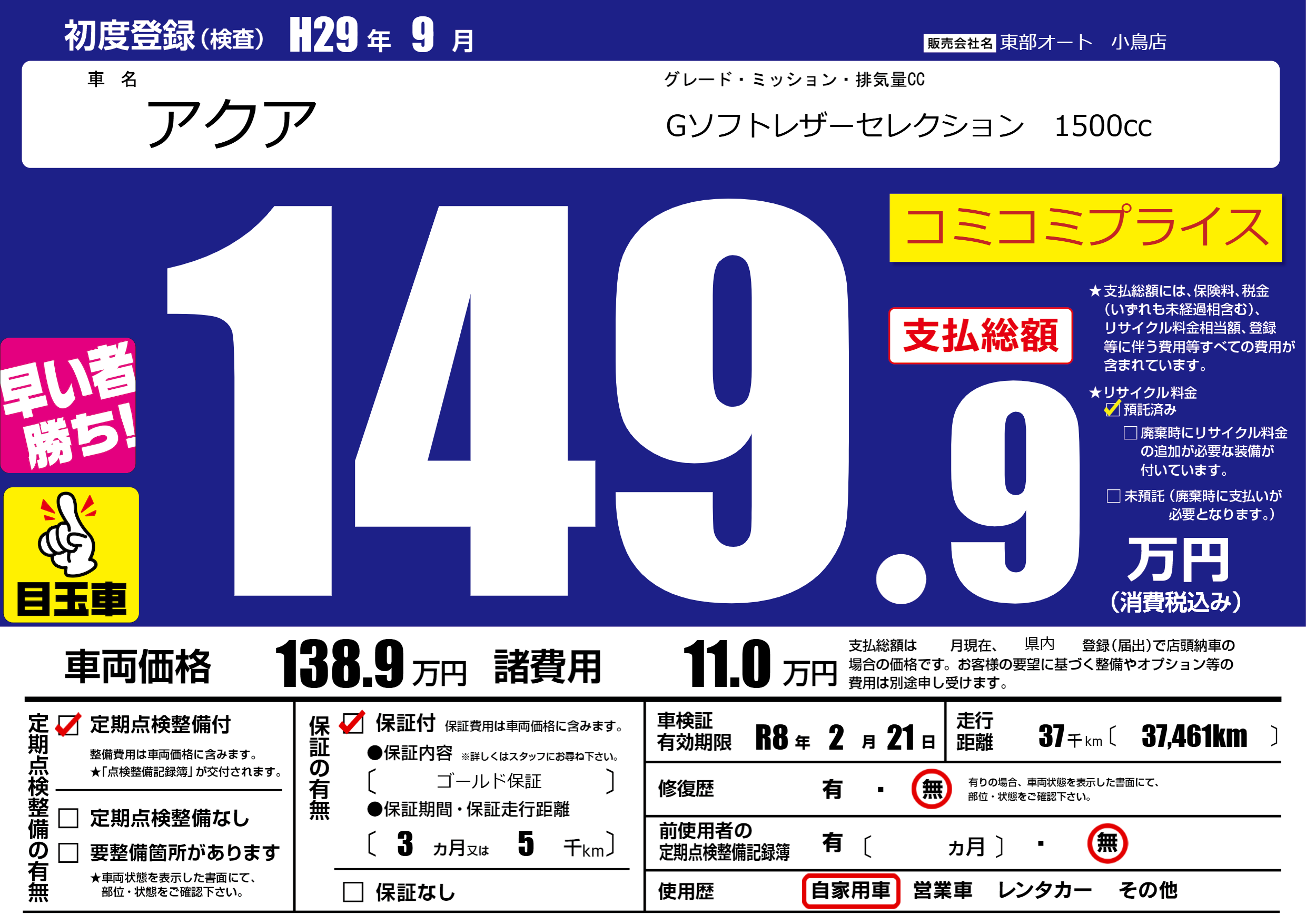保証付き 保証内容( ゴールド保証) 3ヶ月または5千km |
