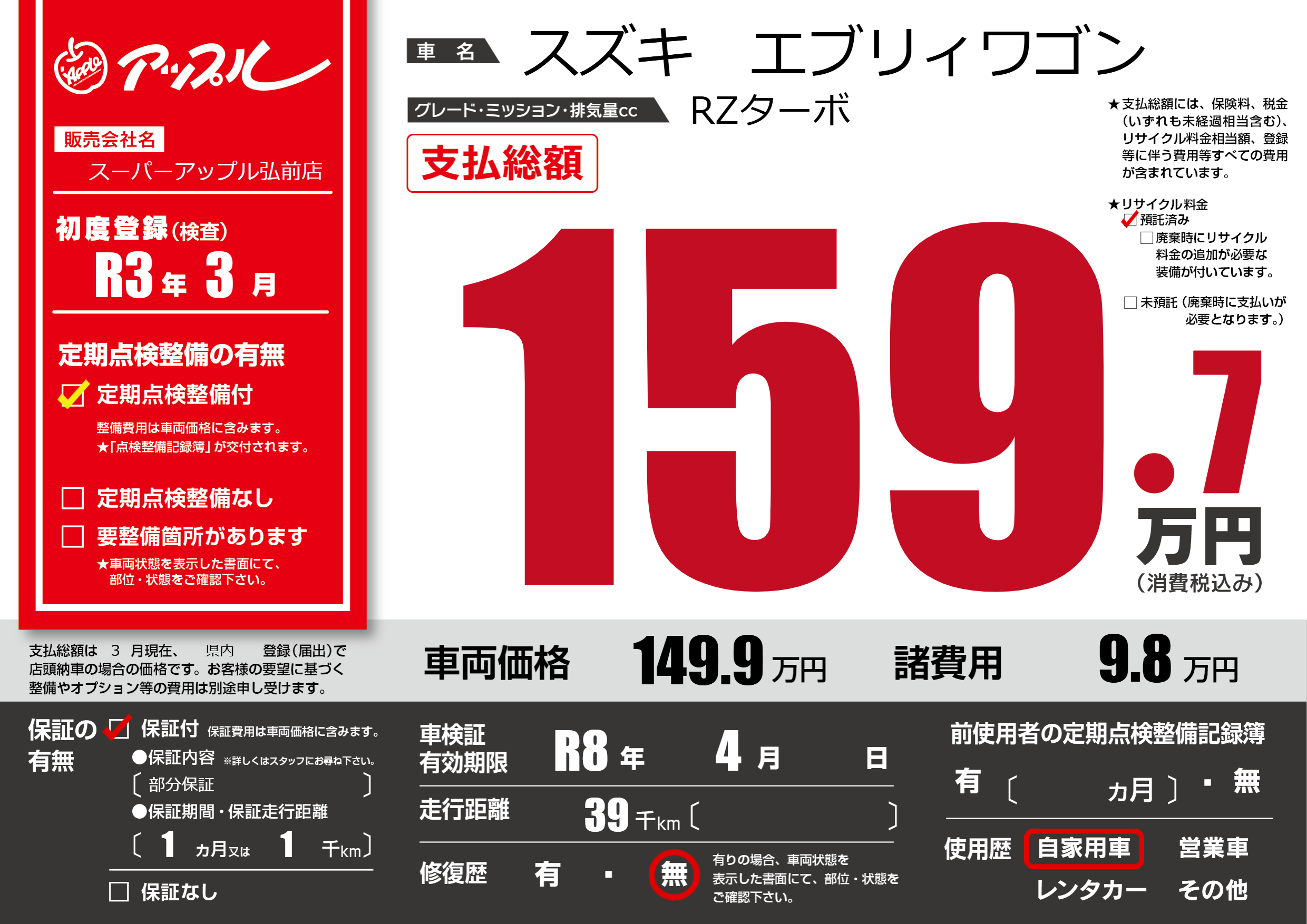 | 走行キロ | 3.9万km | 初年度登録 | R3年3月 |