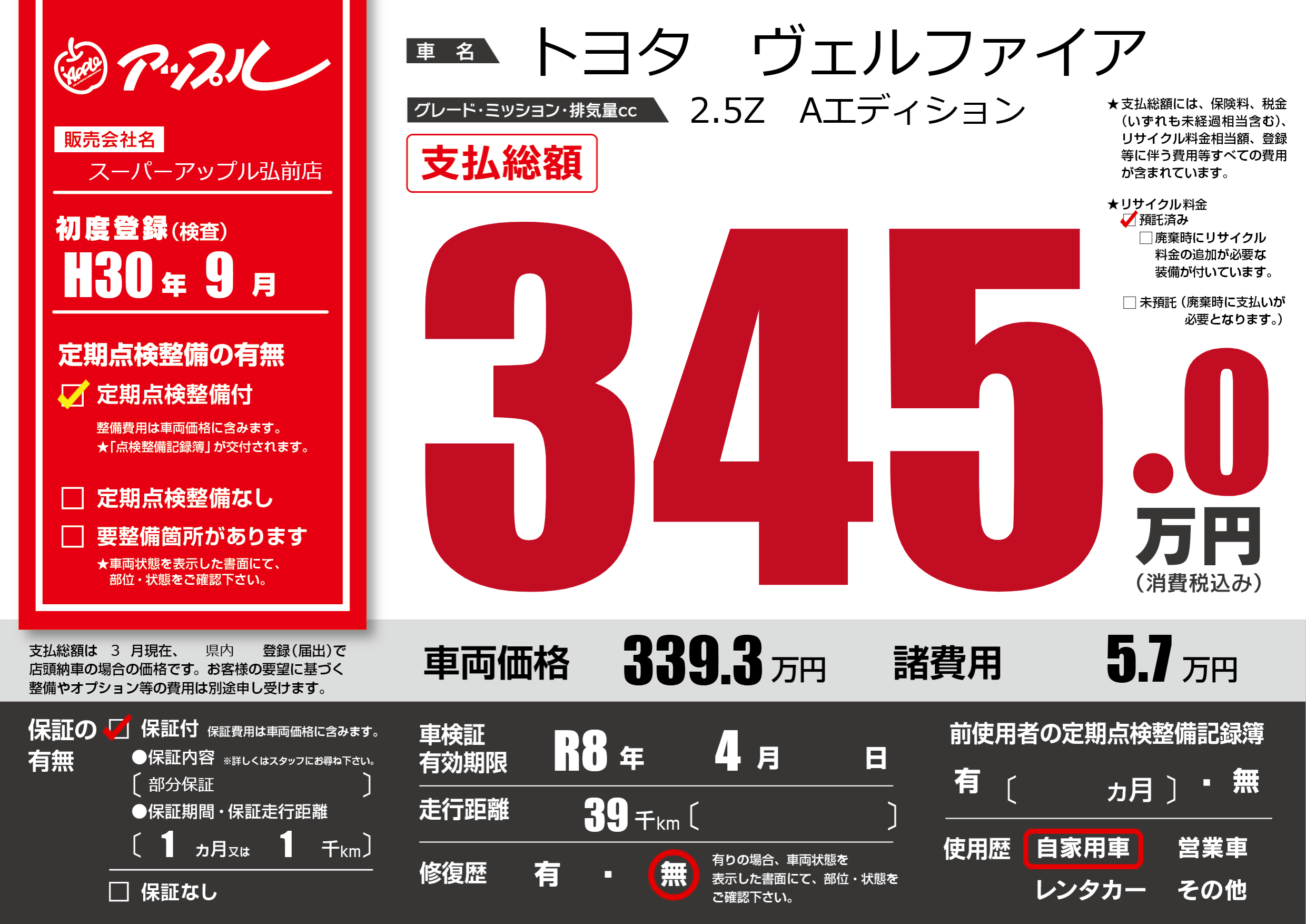 | 走行キロ | 3.9万km | 初年度登録 | H30年9月 |