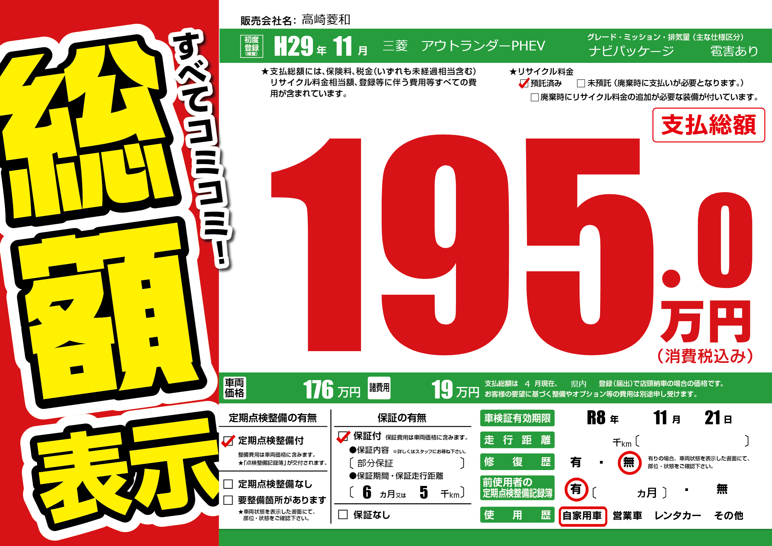 | 車名 | 三菱 アウトランダーPHEV | グレード ミッション 排気量 |