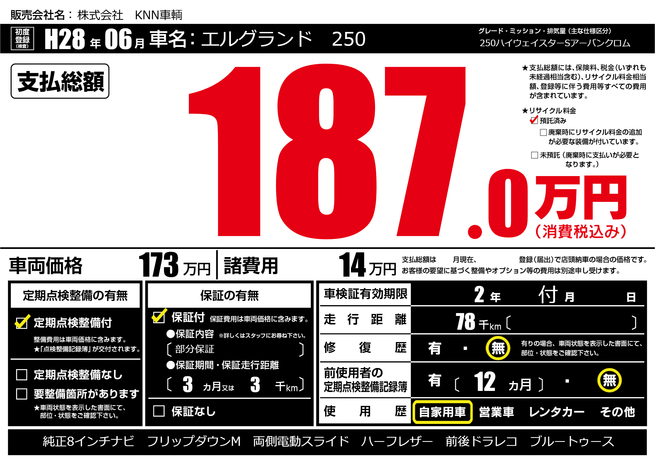 | 車名 | エルグランド 250 | グレード ミッション 排気量 |