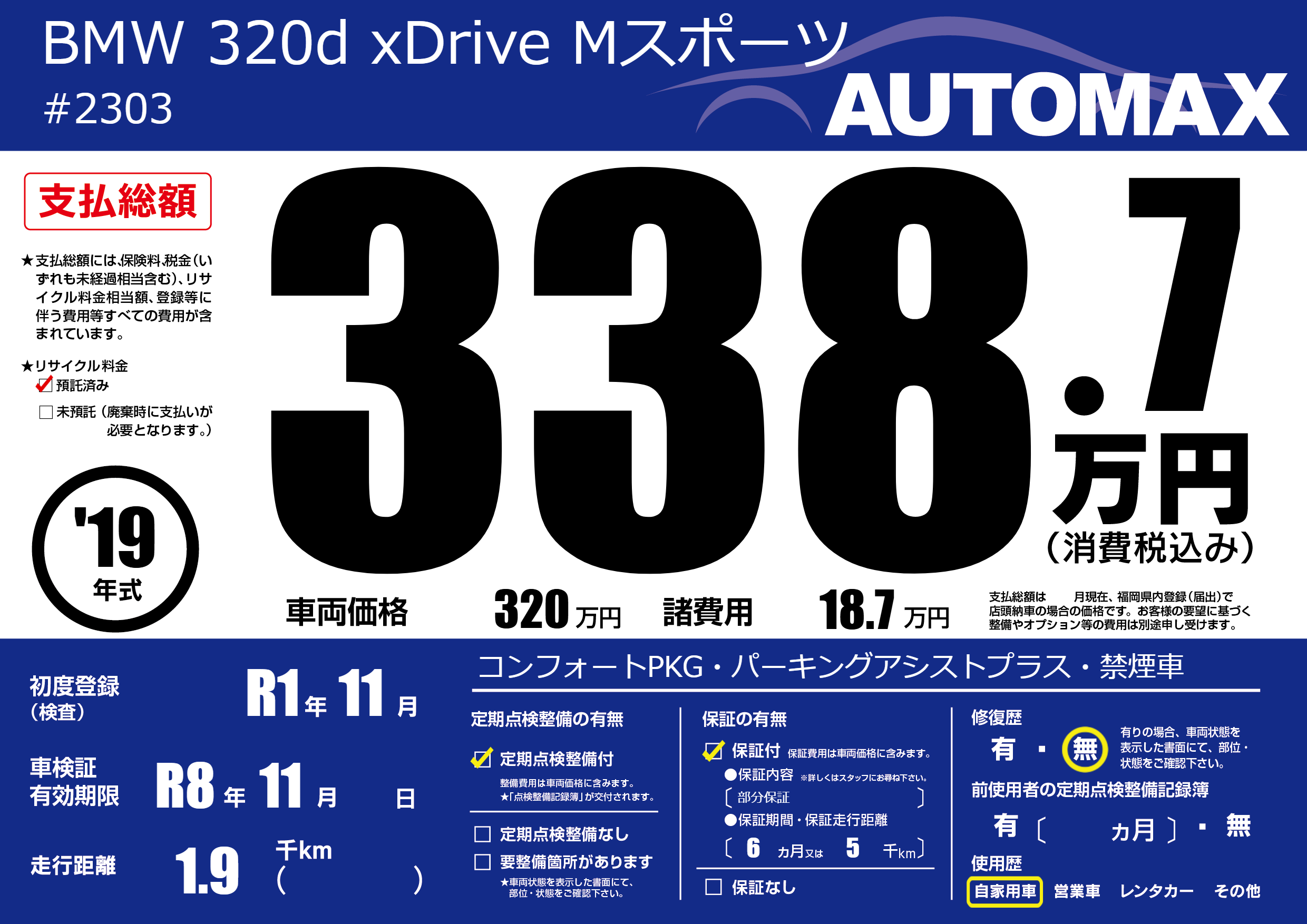 | 車名 | BMW 320d xDrive Mスポーツ | グレード ミッション 排気量 |